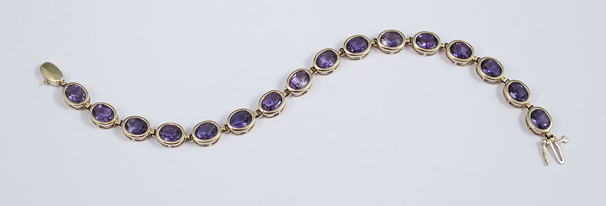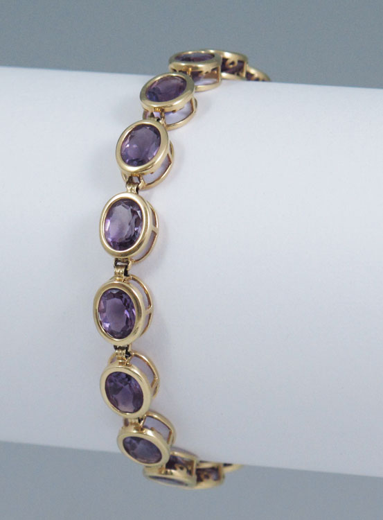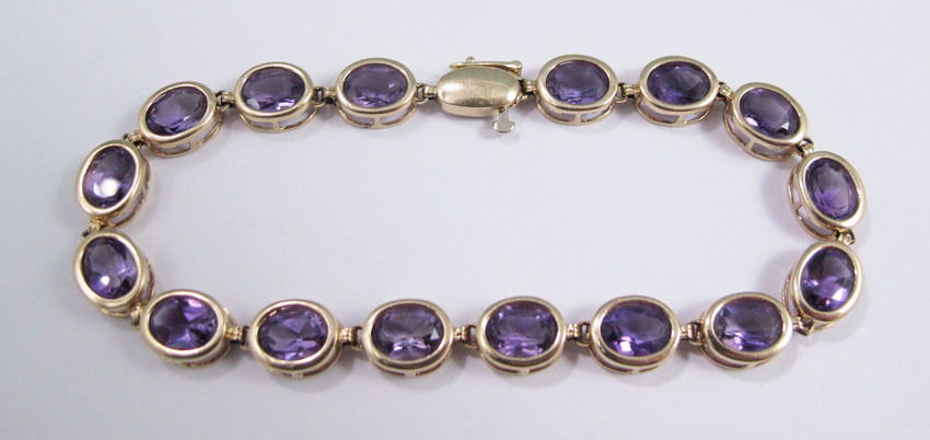 20 CTW AMETHYST & 14K GOLD BRACELET: 14K yellow gold bracelet contains sixteen oval shaped mixed cut amethysts. Weight: 20.00 Ct. Approx. Locking closure with figure eight safety clasp. Length: 7.5'' Weight: 11.6 grams.