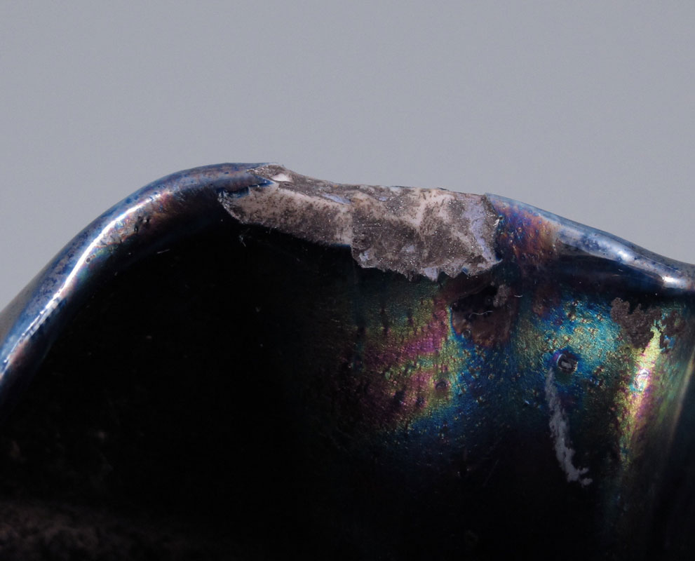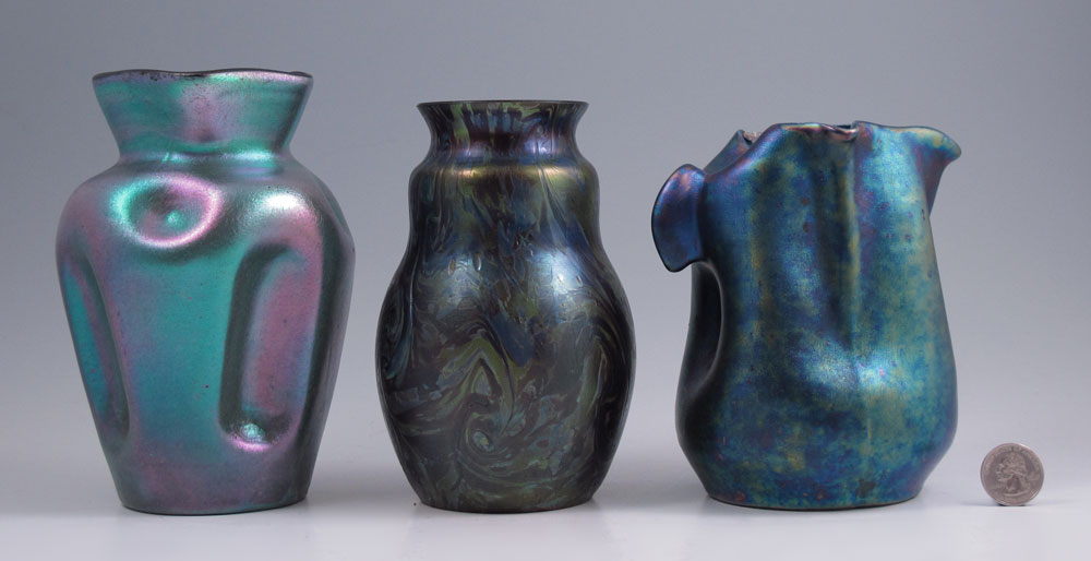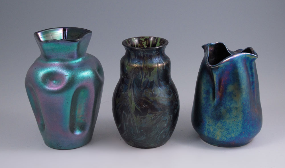 GROUP OF 3 IRIDESCENT ART GLASS VASES: Blue iridescent studio art glass, one with interior red swirls, 5 1/2'' - 6 1/2''.
