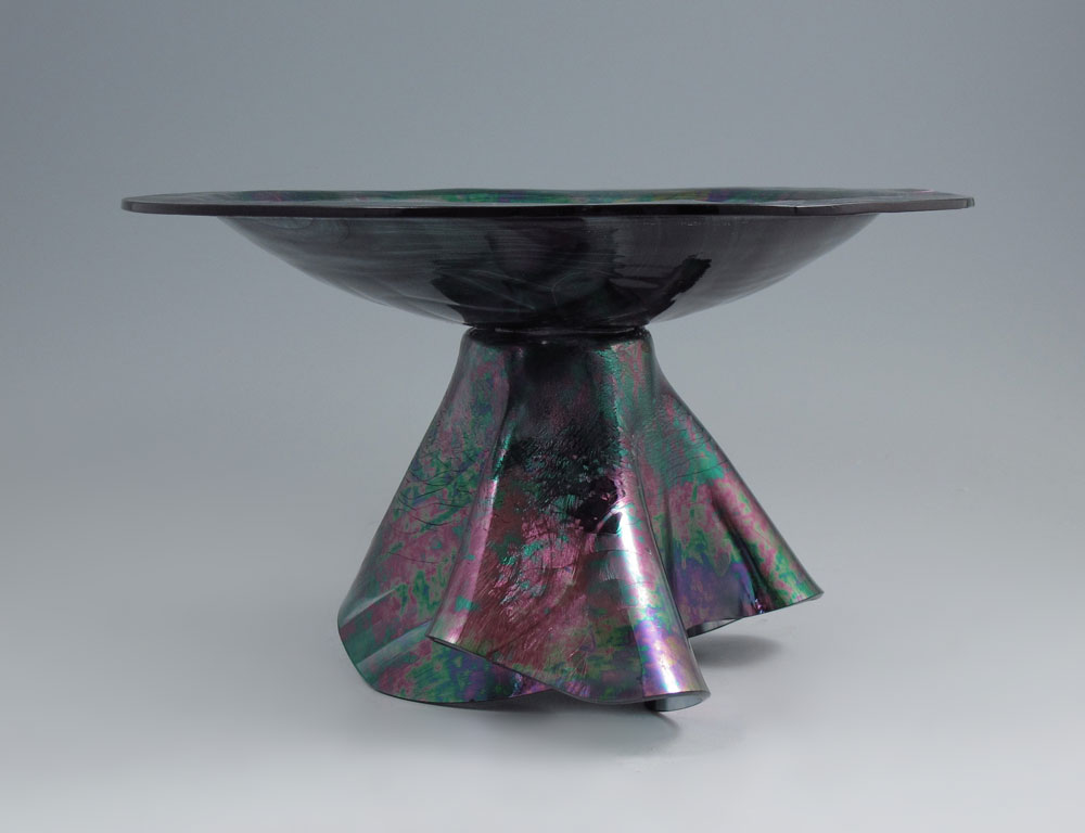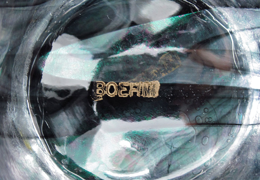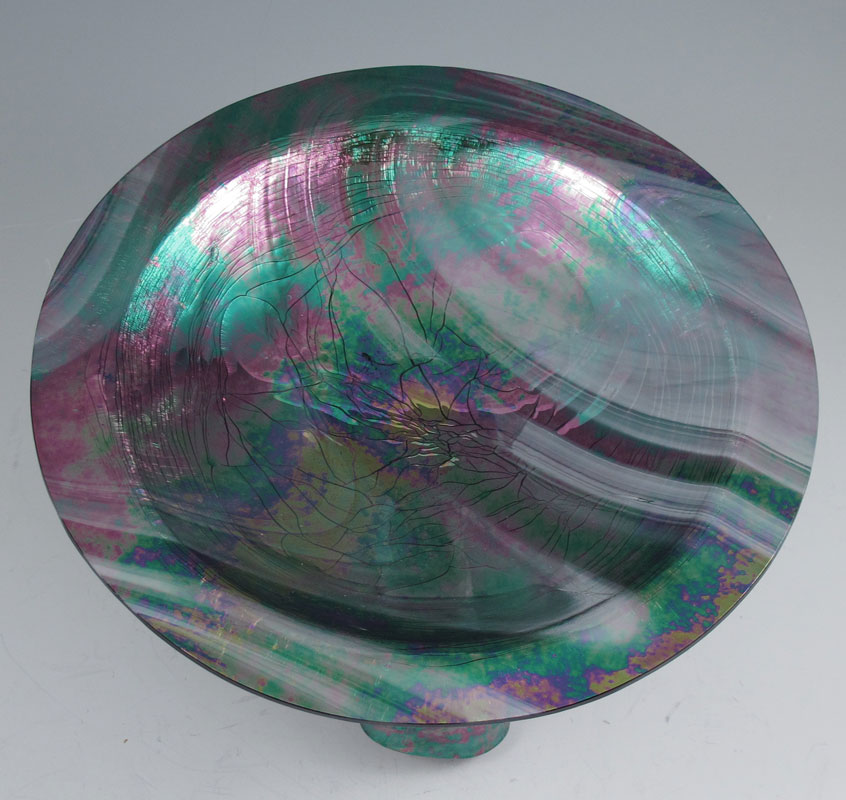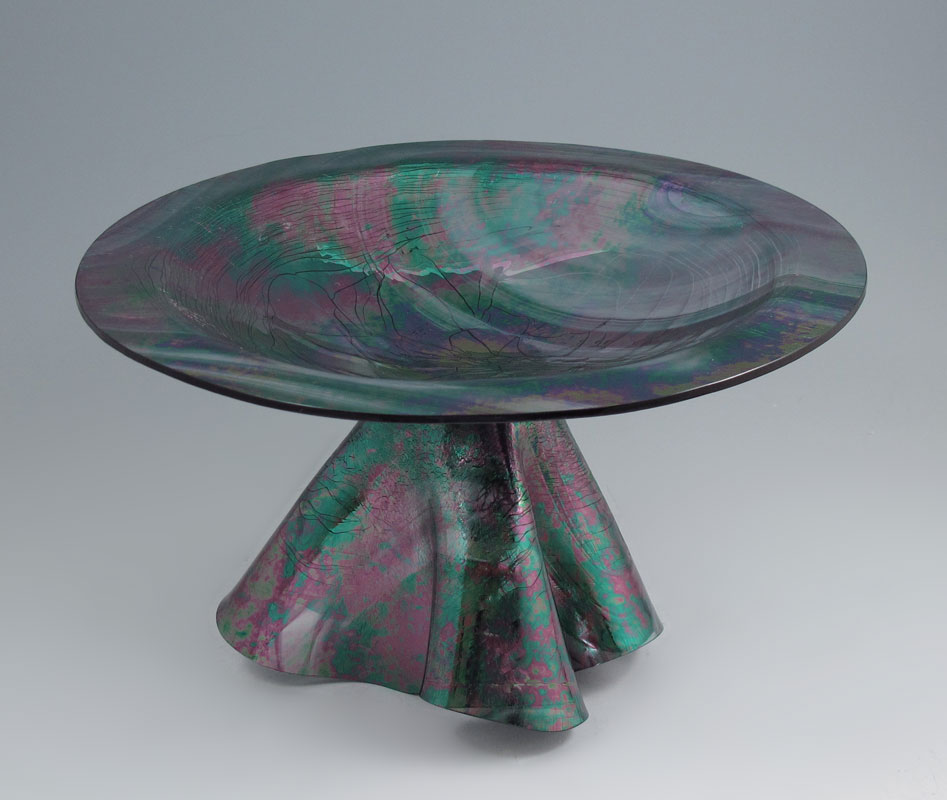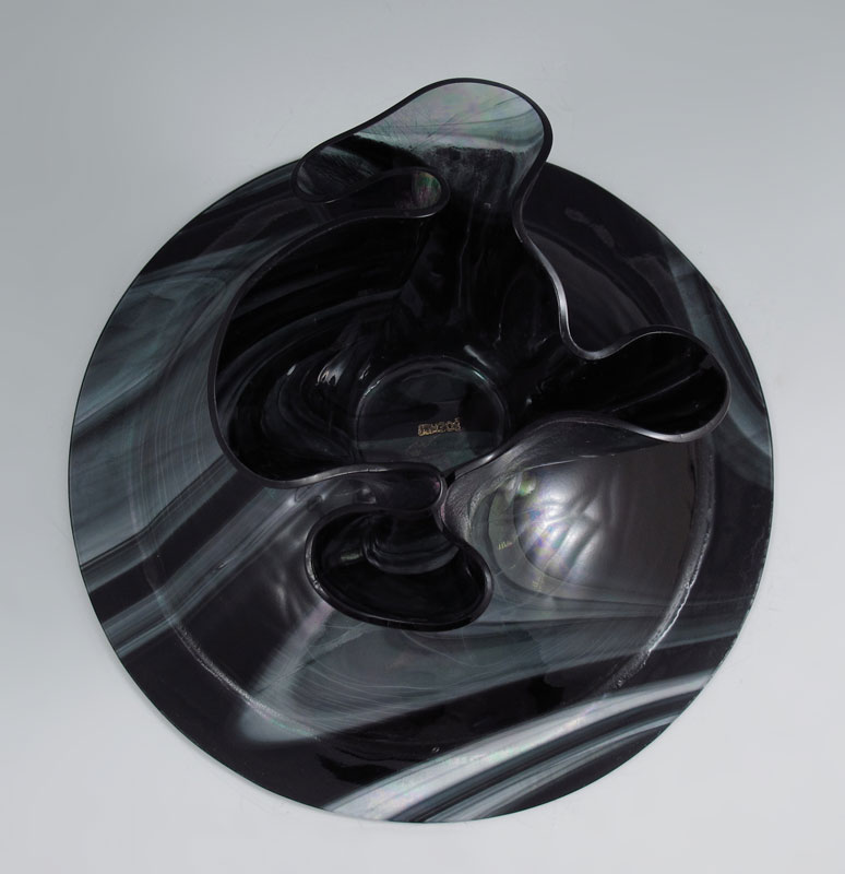 BOEHM IRIDESCENT ART GLASS BOWL: Freeform draped base supports the rimmed bowl, 6 1/2''h. x 11'' dia.
