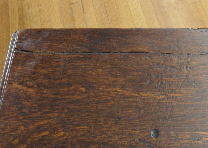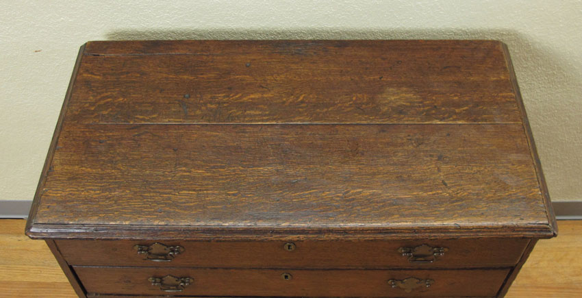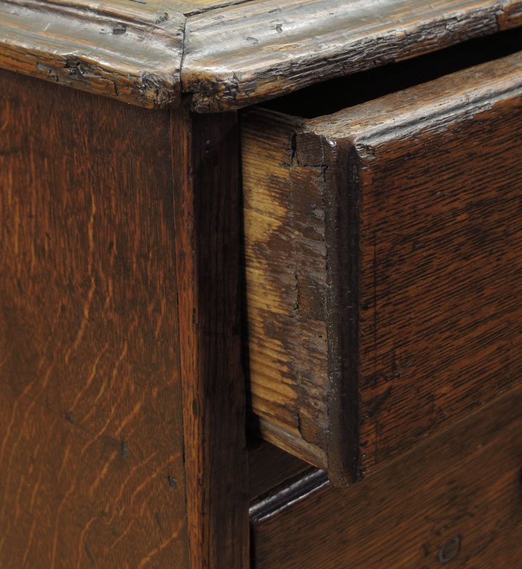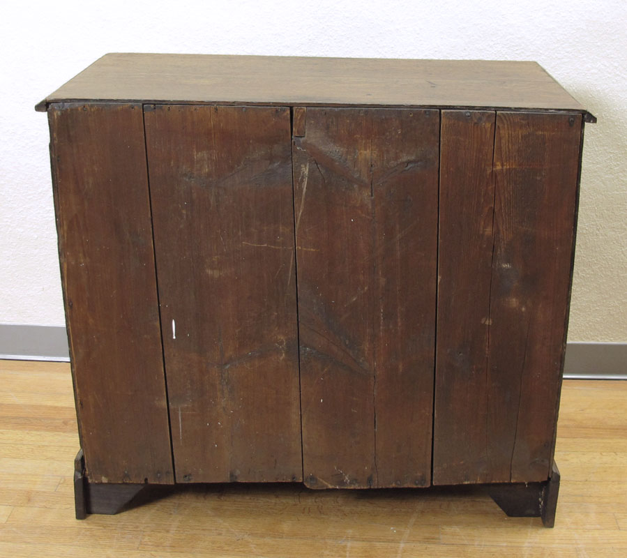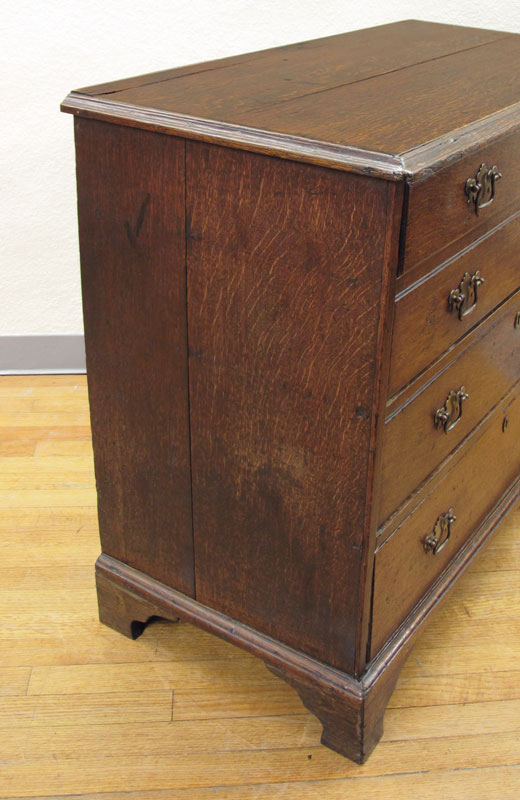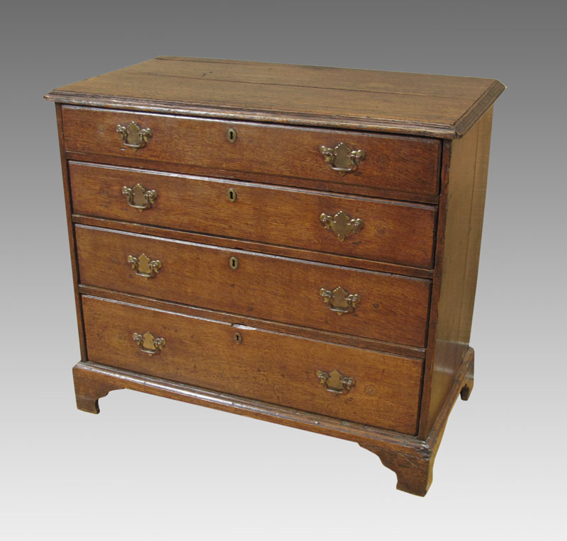 17TH CENTURY ENGLISH CHIPPENDALE 4 GRADUATED DRAWER OAK CHEST: Molded top over 4 graduated drawers with old replacement brass pulls and brass escutcheons. Rose head nail construction on cut bracket base. 33'' h. x 37'' x 19''.