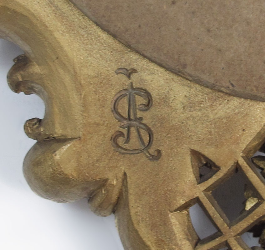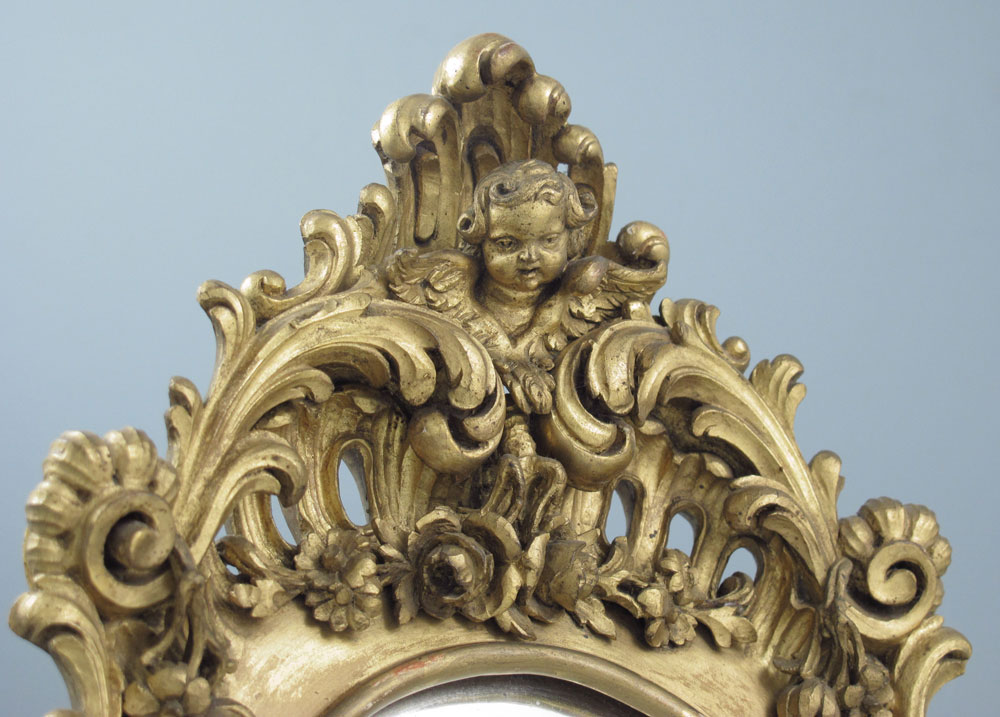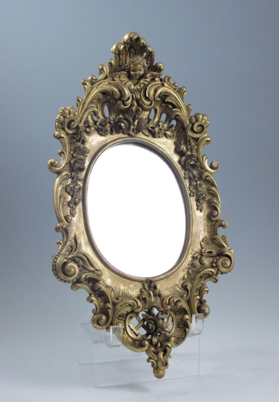 DIMINUTIVE FRENCH ORNATELY CARVED WOOD MIRROR: Oval glass surmounted by a winged cherub, layers of acanthus leaf and flowers. Backstamp S intertwined with A. 15 1/2'' x 8 1/2''