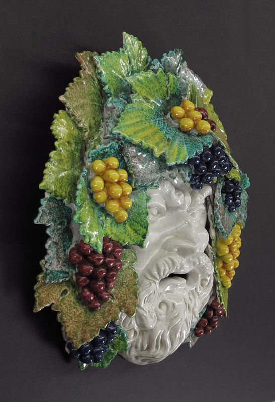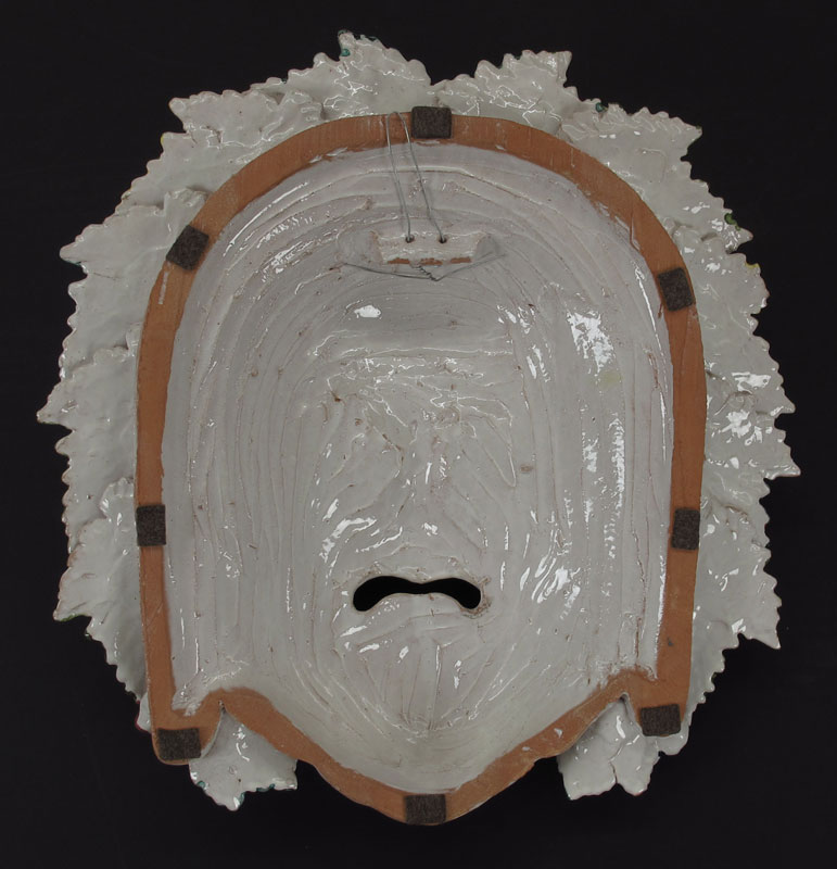 MAJOLICA GLAZED TERRA COTTA MASK OF BACCHUS: Approx. 21'' x 21''.