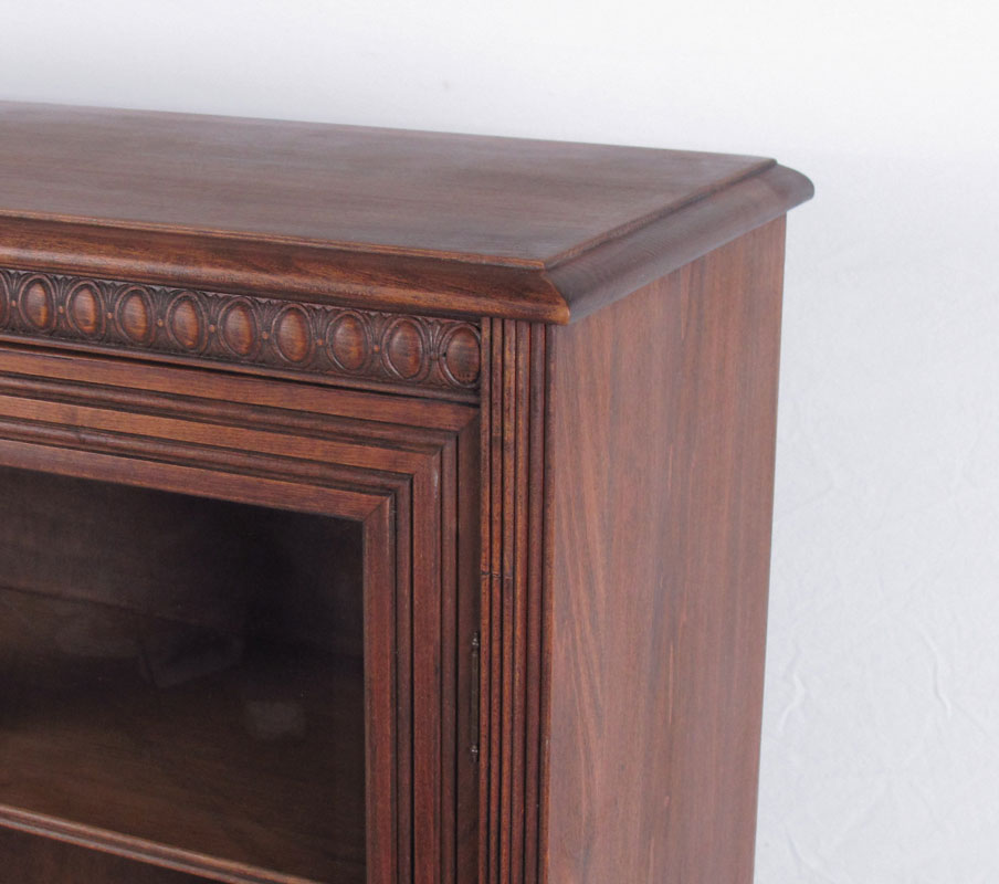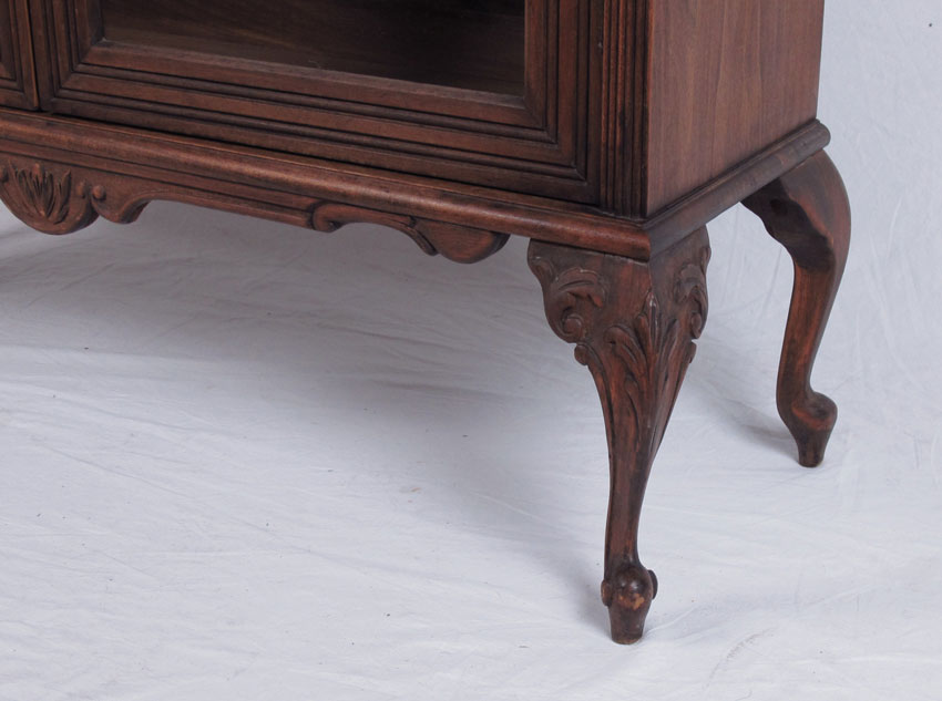 TWO DOOR BOOKCASE ON CARVED FEET: 2 glass doors with 3 wood shelves over carved legs. 53'' h. x 39 1/2'' x 12''.