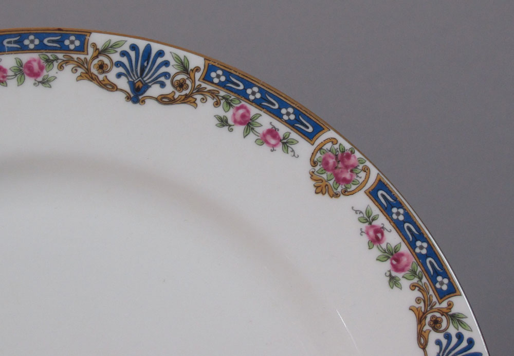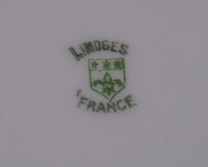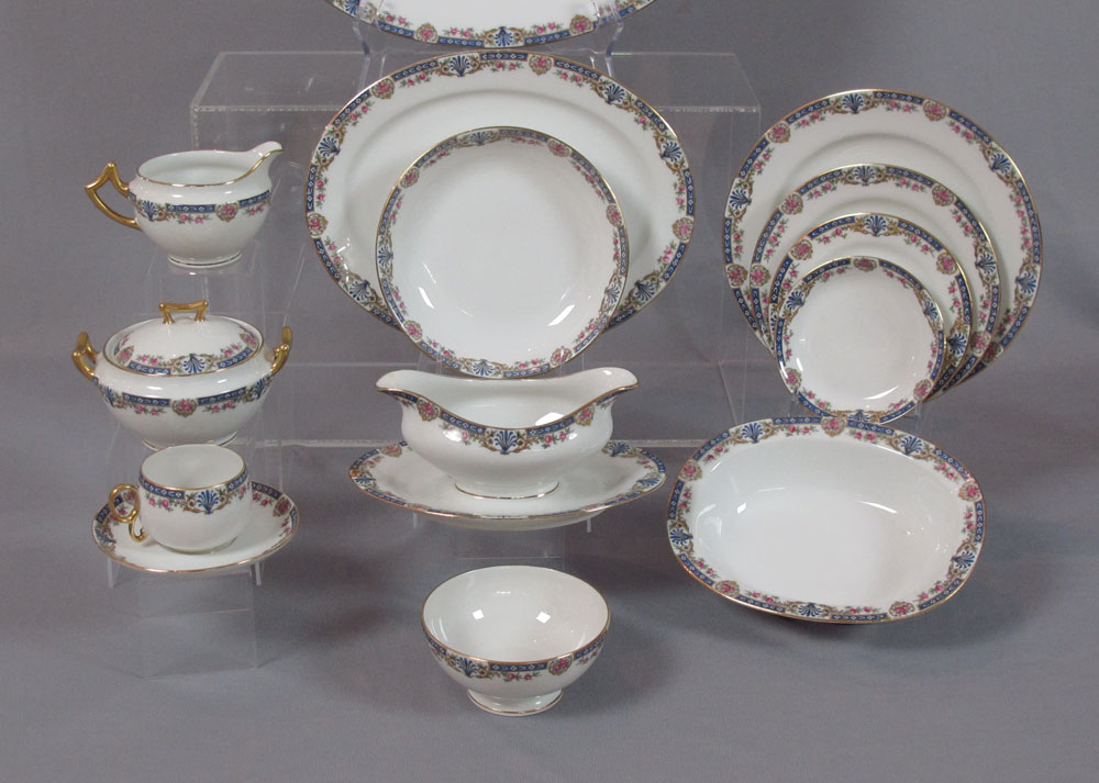 FRENCH LIMOGES BLUE BORDER FINE CHINA: Approx. 79 pieces to include the 16'' and 12'' platters, an oval and round covered vegetable, open sugar, covered sugar, creamer and gravy, 12 dinner plates, 11 salad plates, 12 bread plates, 10 dessert bowls, and 10 cups and saucers.