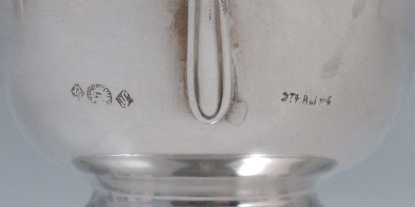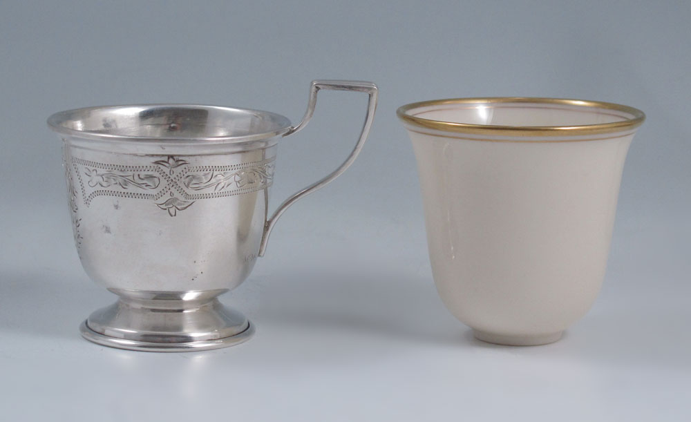 12 STERLING BALTIMORE SILVERSMITHS & LENOX CHINA DEMITASSE CUPS: Gold rimmed Lenox inserts, sterling is monogrammed JWS. Approx. 17 troy oz. 2 1/2'' tall overall.