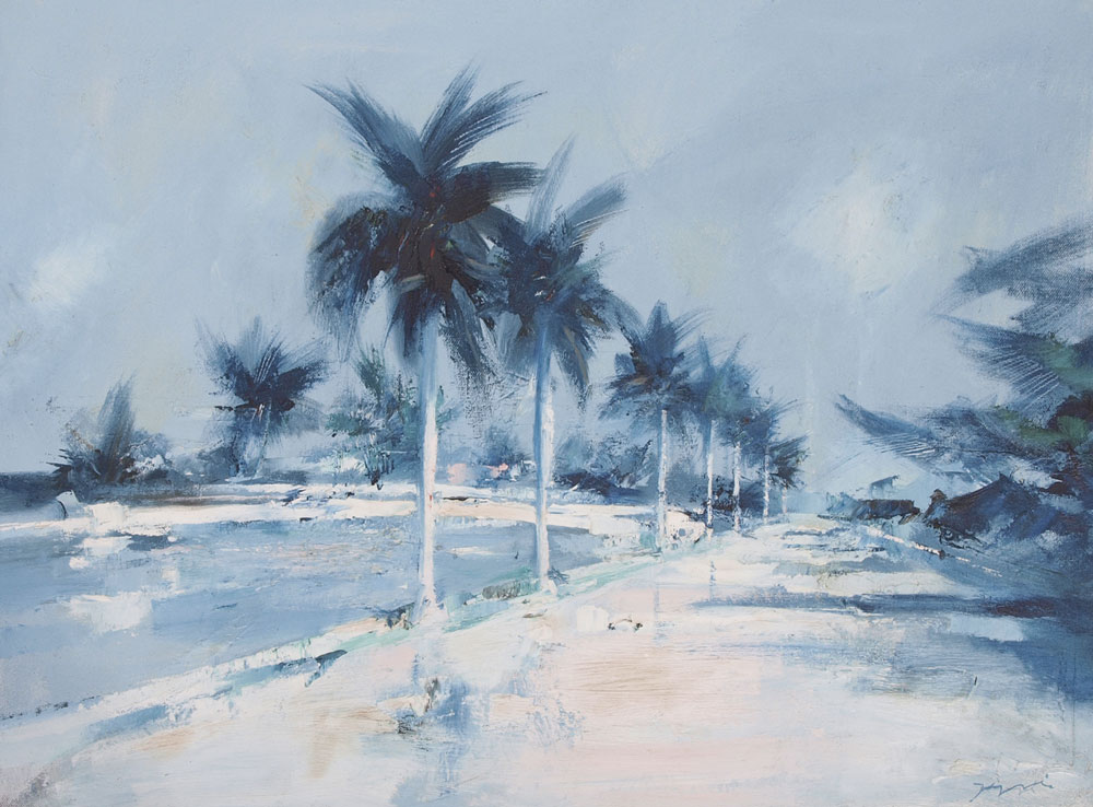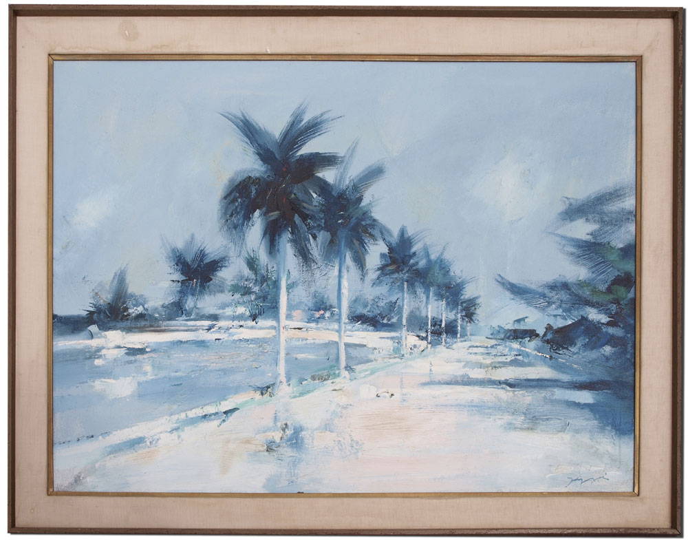 LARGE ILLEGIBLY SIGNED, HIGH-QUALITY WATERFRONT TROPICAL SCENE WITH PALM LINED STREET: Oil/Canvasboard, 32'' x 48'', illegibly signed lower right, custom period frame, 38 1/4'' x 54 1/2''.
