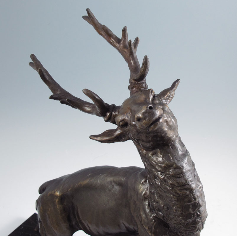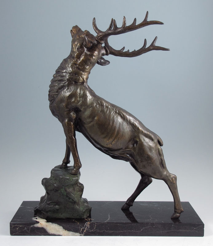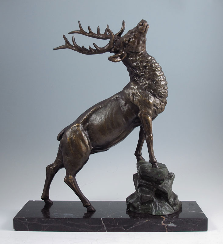 PATINATED METAL ELK SCULPTURE: Affixed to marble base. No visible signature. 18'' h. x 16'' x 5 3/4''.