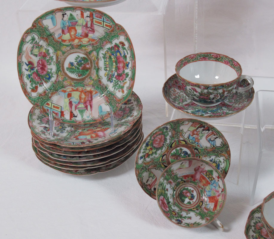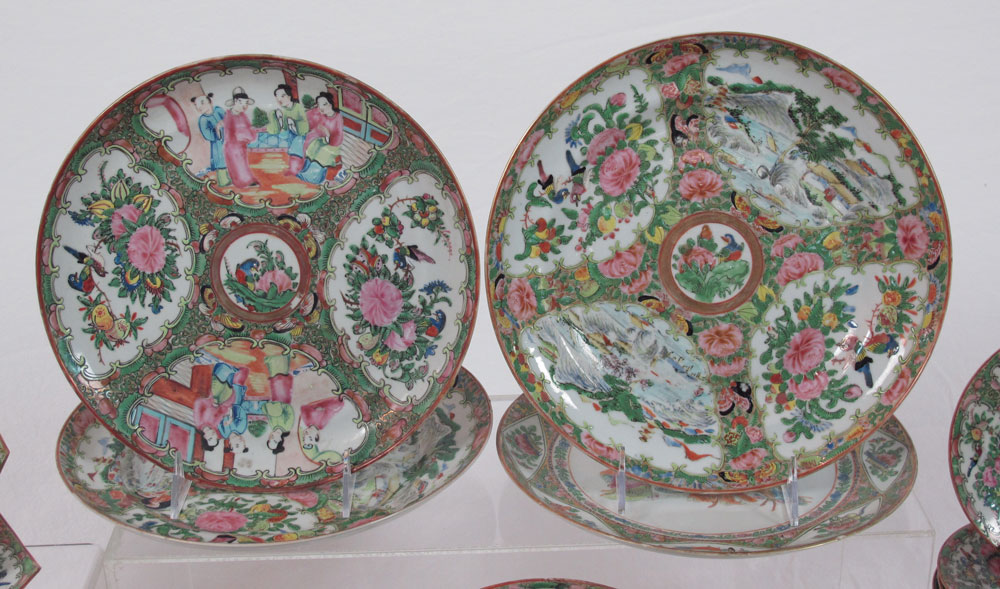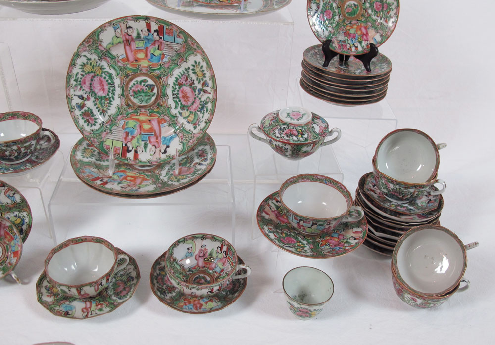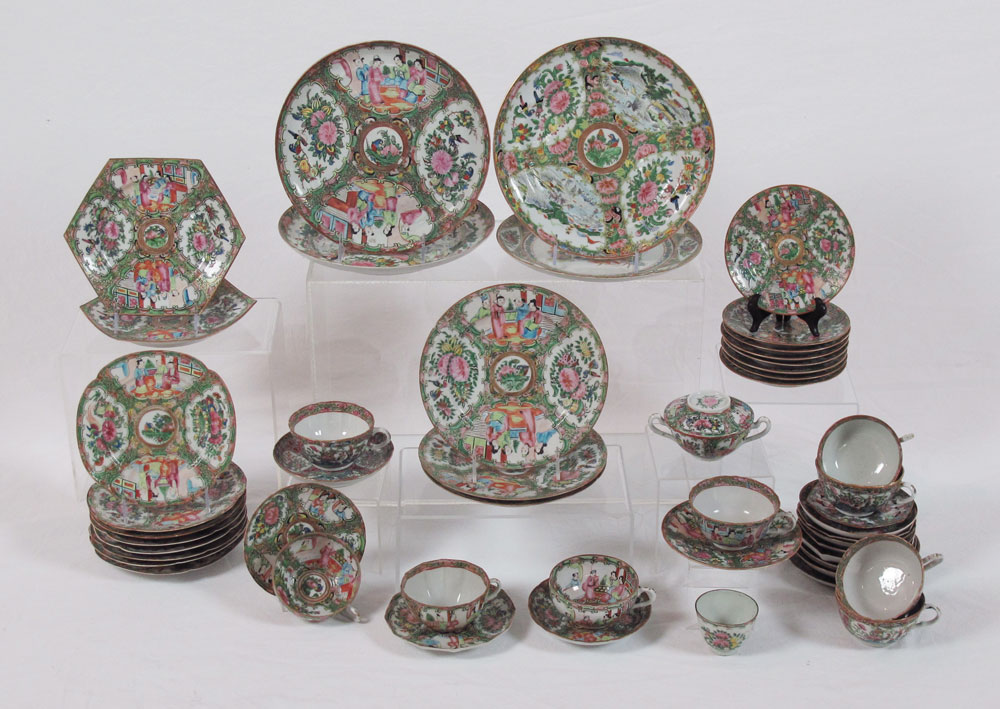 ASSEMBLED COLLECTION OF ROSE MEDALLION CHINA: Approx. 51 pieces with variance in designs, most unmarked, to include 4 plates (10''), 3 salad (8 1/4''), 8 bread (7 1/2''), 23 assorted small plates / saucers (4 3/4'' to 6'' dia.), 2 6 sided plates (7 1/2''), 9 teacups (2'' h. x 4 3/8''), covered sugar (3'' h. x 5 1/2''), saki (2'' h.).