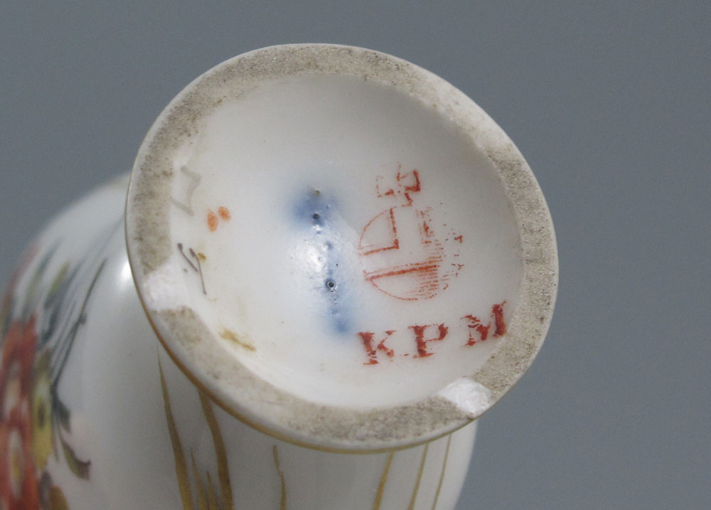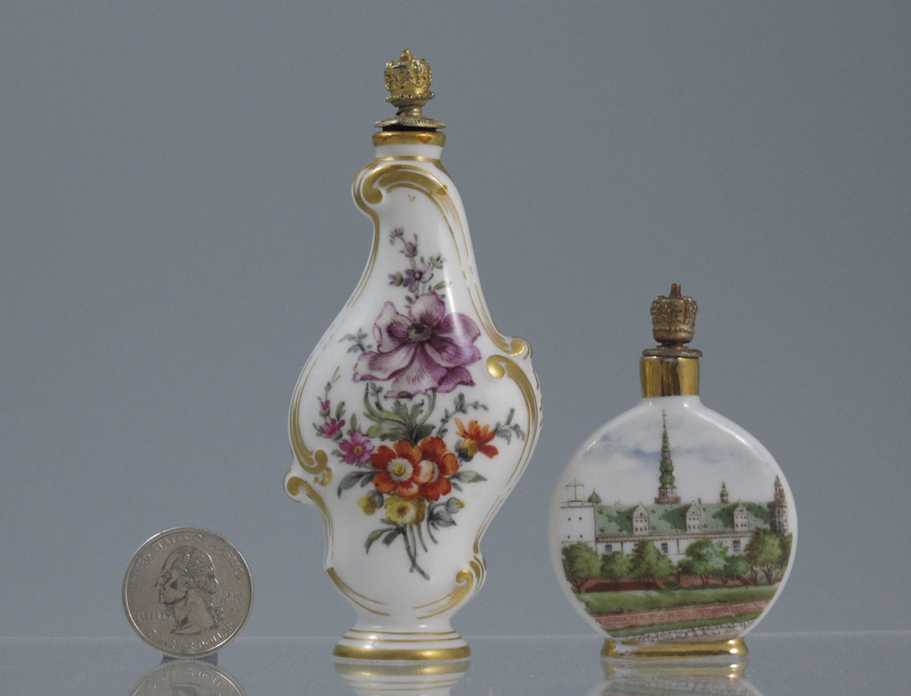 2 PORCELAIN SCENT BOTTLES INCLUDE KPM: 1) Signed KPM bottle, parcel gilt, handpainted floral and figure verso. 4 1/2'' tall. Tiny flecks on the underside. 2) Round bottle, hallmarked with red S, 2 1/2'' h.
