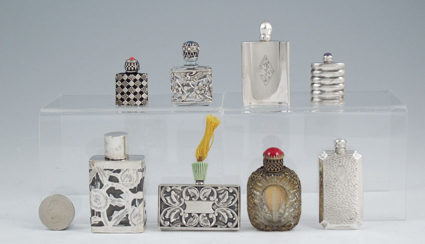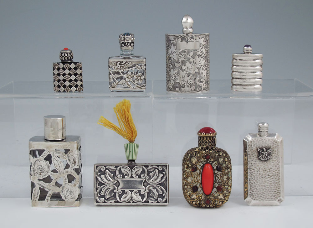 8 PIECE COLLECTION OF STERLING AND OVERLAY SCENT BOTTLES: To include 1) Illegibly marked Mexican sterling overlay, 2 1/2''. 2) Ribbed Mexican sterling with purple stone cabochon, 1 3/8'' h. 3) Continental 900 silver 1 7/8'' h. 4) 950 silver with engraved foliate design, 2 1/4'' h. 5) French black glass with metal overlay, red stone cabochon, 1 1/4'' h. 6) French clear glass with silver metal overlay, blue stone cabochon, 1 3/4'' h. 7) Czechoslovakian glass with gold toned filigree overlay, ruby glass and red stone decoration, 2 1/4'' h. 8) American silverplate with eagle ornament, engraved MAC 1925, 2 3/8'' h.