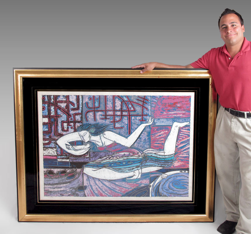 Adrian Wong Shue, (Jamaican/American, 20th C.): ''Song Bird'', Serigraph, site size 34'' x 46'', pencil signed lower right, numbered lower left 128 of 300, Austin Studios Certificate of Authenticity verso, custom frame and mat, frame does have wear to the gilt, 48'' x 62''.