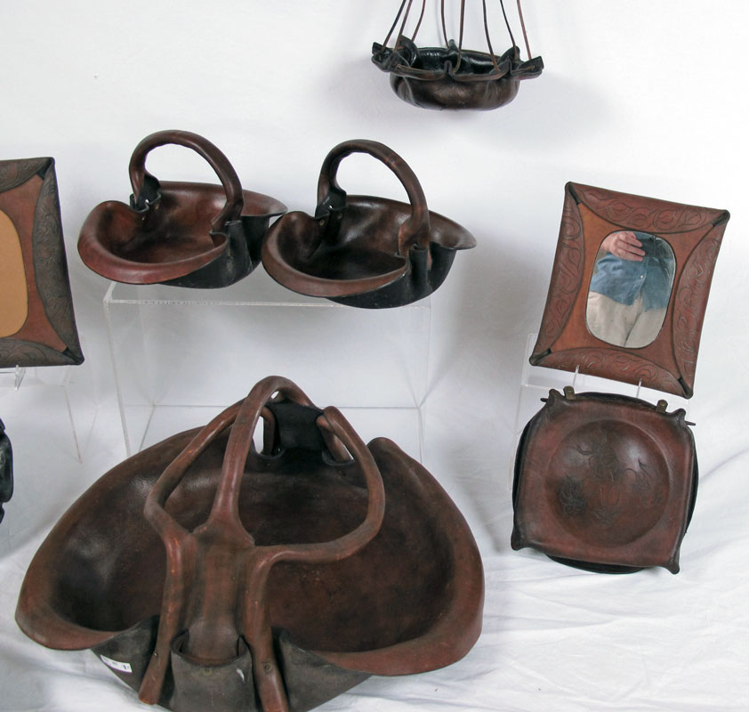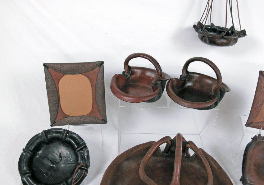 COLLECTION OF HARD LEATHER BASKETS: To include 1) 3 handled baskets marked with impressed H for Fred and Nina Hamburg, largest 12 1/2'' h. x 24'' x 18 1/2''. 2) Bowl marked with impressed H, 3 1/4'' x 10 3/4''. 3) Hinged covered box marked with impressed H, 2'' x 10 3/4'' square. 4) 2 hanging baskets, unmarked, largest 4'' h. x 12 3/4''. 5) 2 frames, one with mirror, unmarked, largest 12'' x 10 1/2''.