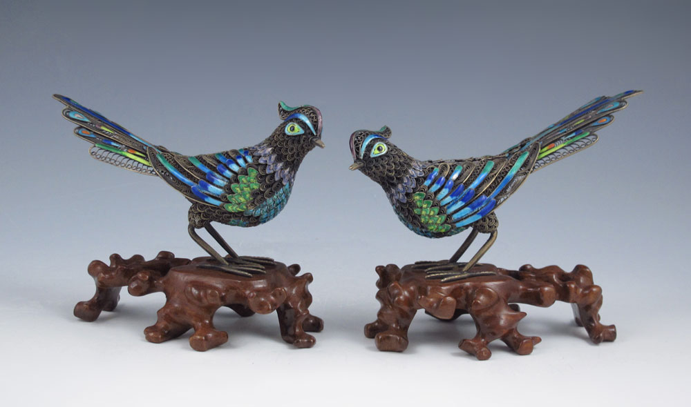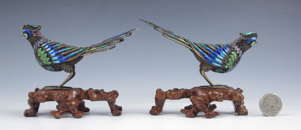 PAIR OF ENAMELED STERLING BIRDS OF PARADISE: Pair with enamel feather over hand crafted sterling bodies. Marked Hand Made 925 Silver, P. R. C., 001 of 500 on carved wood base of both. 3 1/2'' x 5 1/4'' x 2 1/2''.