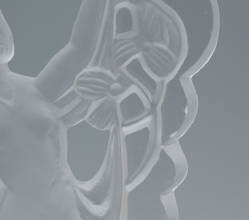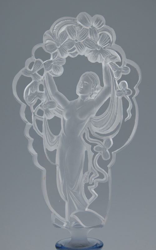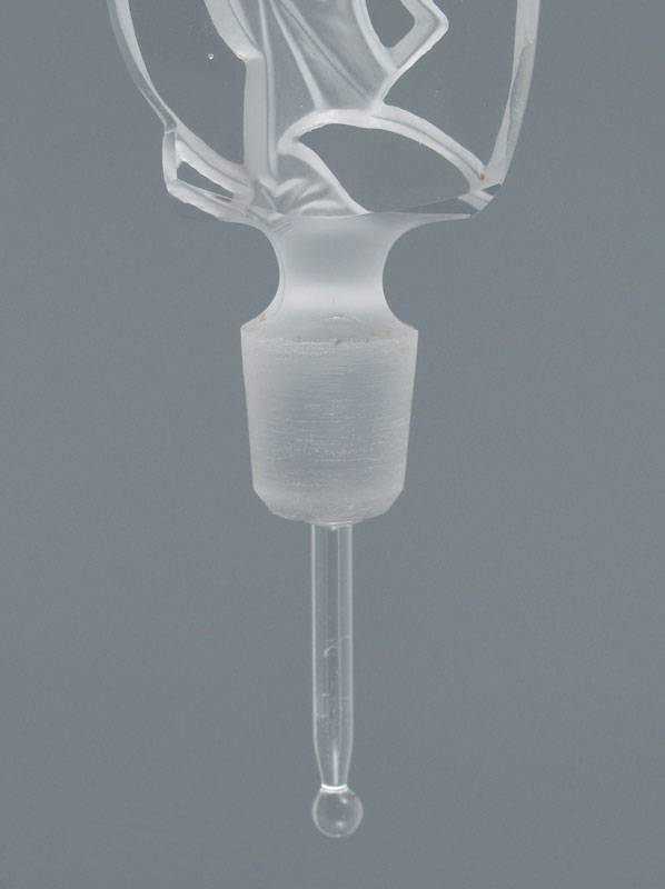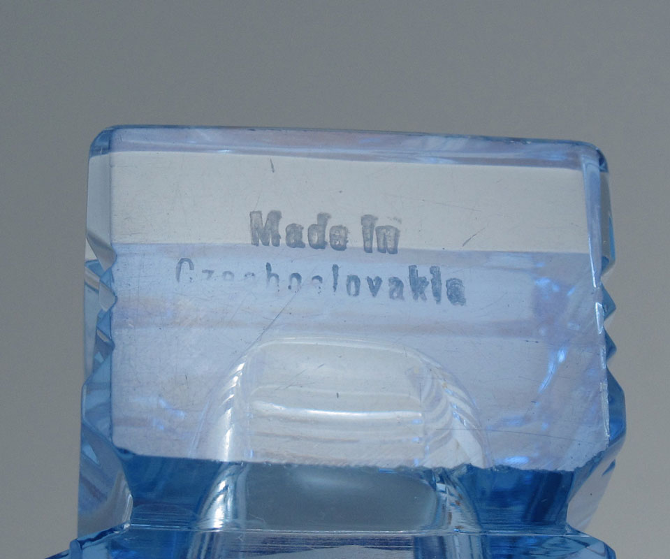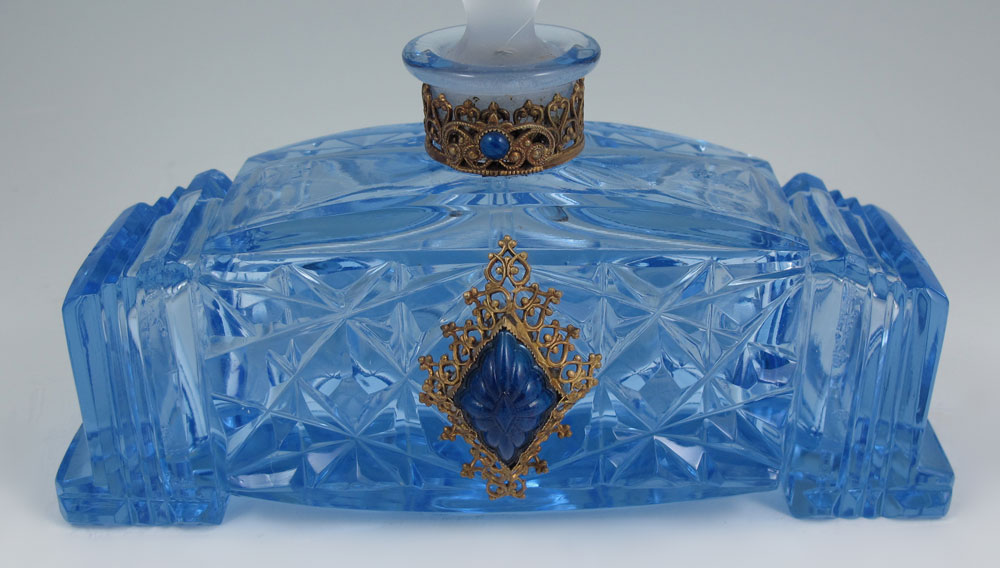 VINTAGE CZECH GLASS PERFUME WITH NUDE STOPPER AND JEWELED METALWORK, CIRCA 1920'S: Frosted glass nude under garland of flowers, dauber intact. The cut glass blue bottle is signed ''Made in Czechoslovakia''. 8 3/4''h. x 5 3/4'', overall.