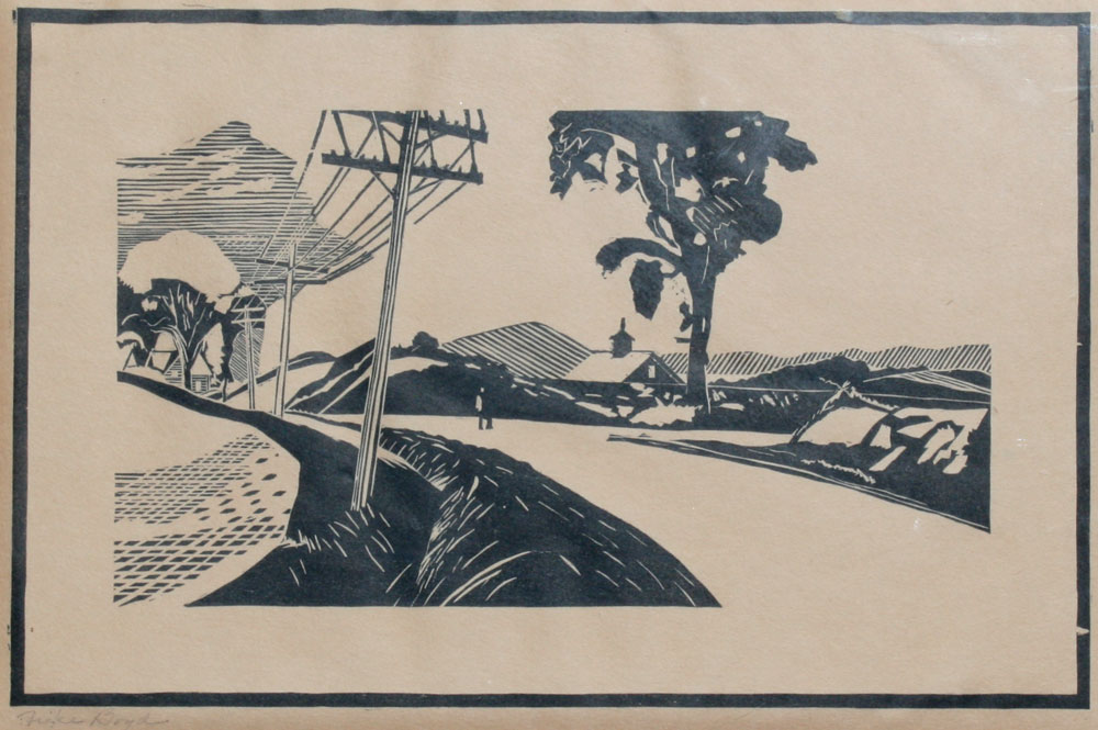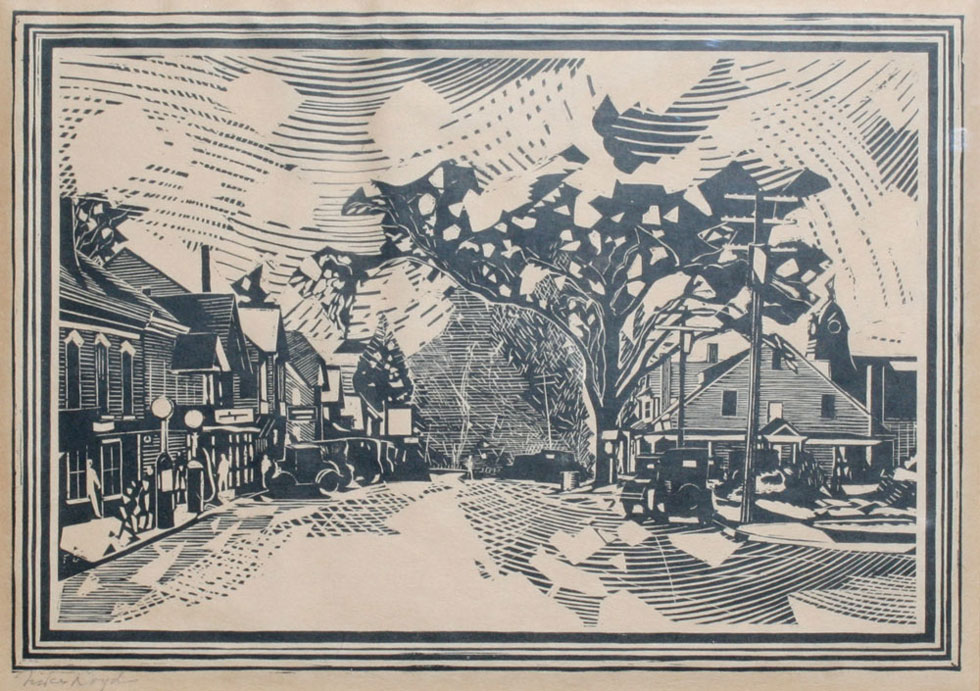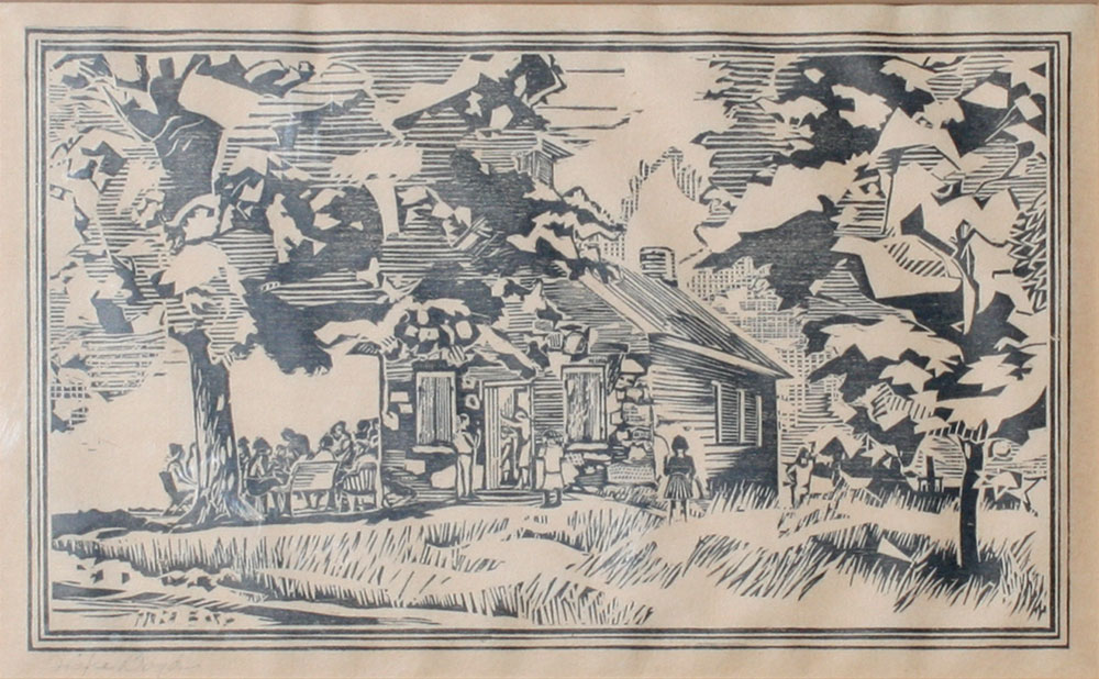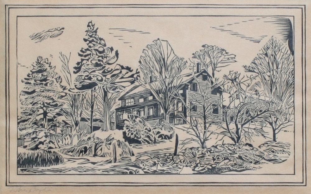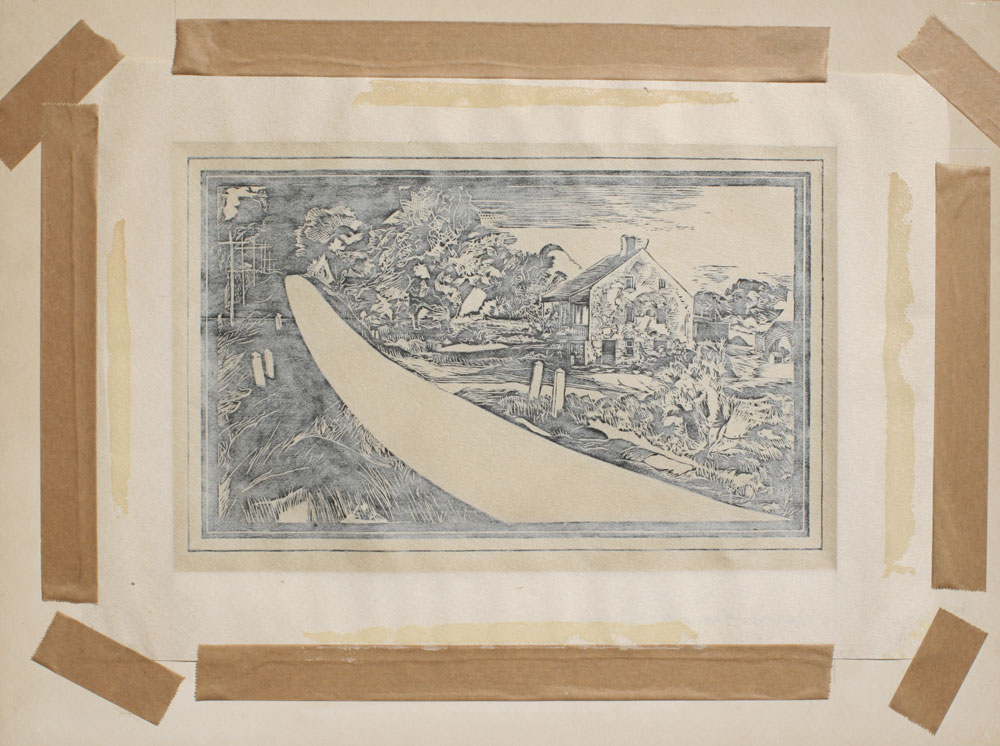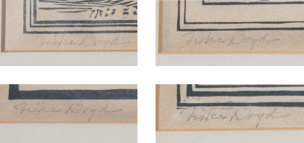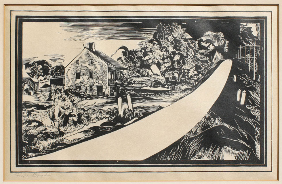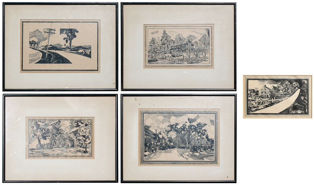 BOYD, Fiske, (American, 1895-1975): 5 PIECE LOT OF WOODBLOCKS TO INCLUDE: 1) Landscape With House By a Road, 10 1/8'' x 14 1/2'' with margins, pencil signed lower left, unframed, affixed to mat, 14'' x 18'', taped to mat verso; 2) Town Street Scene, sight size 9 1/4'' x 13'', pencil signed lower right, framed, 14 1/2'' x 18 1/2'', not examined out of the frame; 3) Highway Scene With Figure Standing in the Road, sight size 8 1/2'' x 12 1/2'', pencil signed lower left, framed, 14 1/2'' x 18 1/2'', not examined out of the frame; 4) Country Gathering, sight size 6 3/4'' x 11'', pencil signed lowered right, framed, 14 1/2'' x 18 1/2''; 5) Country Home, sight size 7 1/4'' x 11'', pencil signed lower right, framed, 14 1/2'' x 18 1/2''.