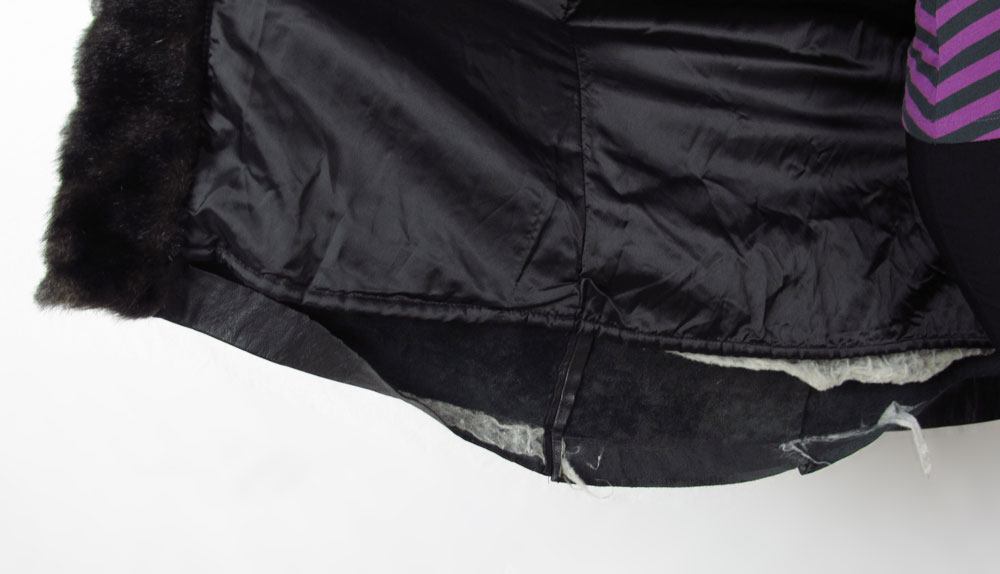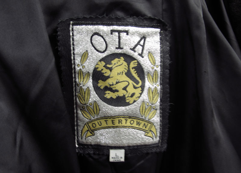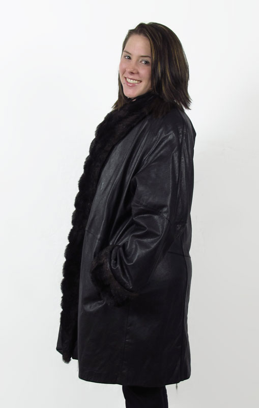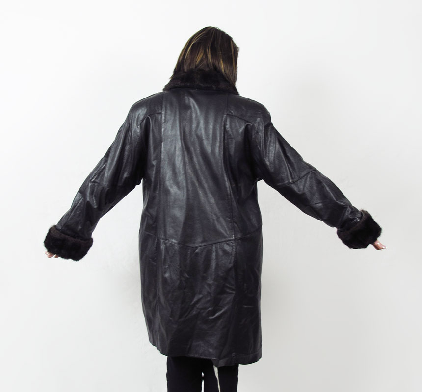 BLACK LEATHER COAT WITH FAUX FUR COLLAR: Black satin lining. OTA, Outer Town, made in China. Size large. 38'' long.