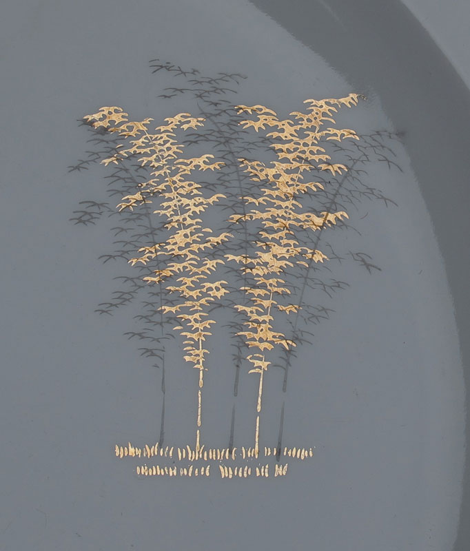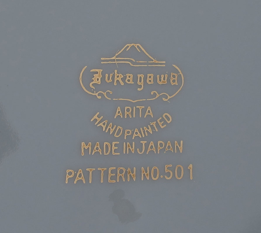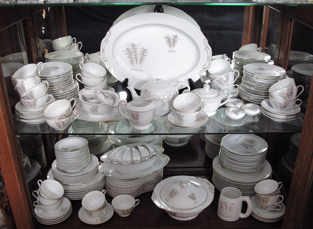 FUKAGAWA JAPANESE FINE CHINA IN THE GOLD BAMBOO PATTERN 501: Arita Japan, discontinued in the 1950s. Approx. 150 piece service for 12 include 15 dinner plates, 12 salad plates, 15 bread, 12 soup bowls, 12 dessert bowls, 12 toast plate (with cup holder rings), 35 cups in two sizes, and 22 saucers. Service pieces are the teapot, 16'' platter, 12 '' platter, a mug, creamer, sugar, gray open vegetable, covered vegetable ( chip), and 7 ashtrays.
