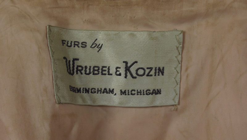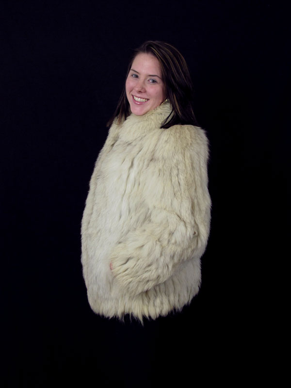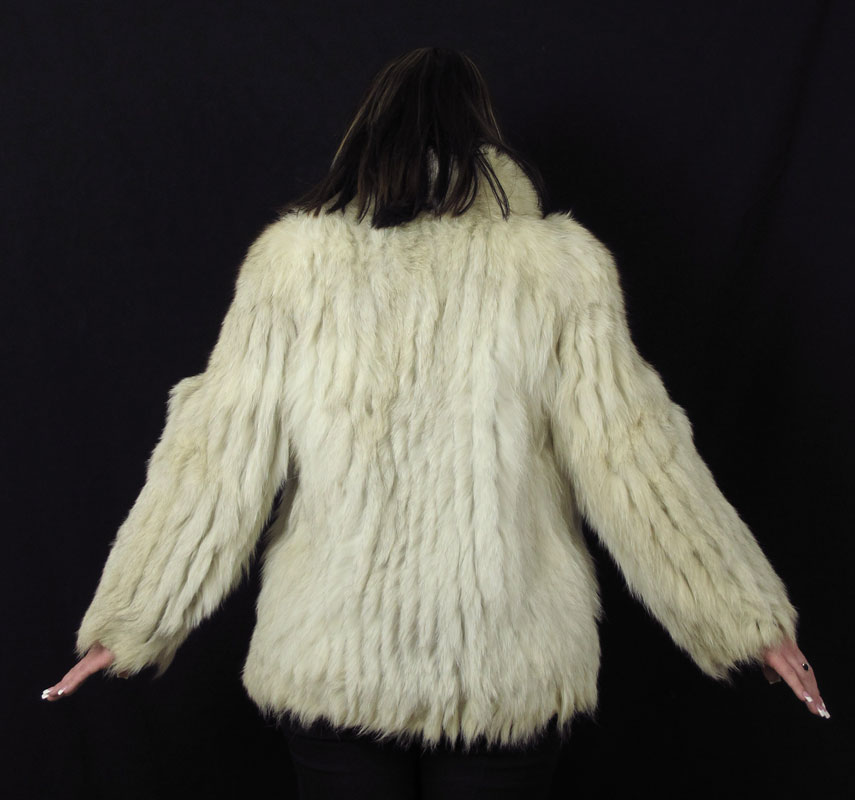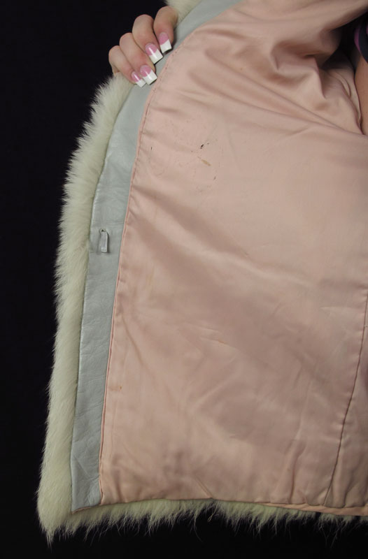 SAGA SHORT COLLAR WHITE FUR JACKET: White short collared fox fur jacket with strip style pattern, peach lining. Saga Fox Furs by Wrubele Kozin, Birmingham, Michigan. Beige / light tan velvet strips alternating pattern. 30'' in length.