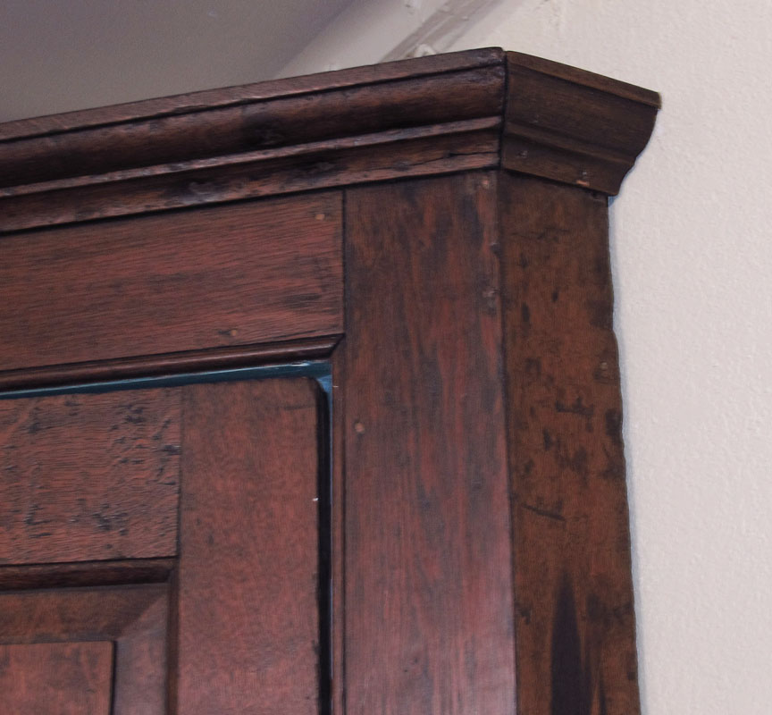 EARLY ENGLISH OAK WALL MOUNT HANGING CORNER CABINET: Single paneled door, painted shelved interior, approx. 37''h. x 28'' wide across the front.