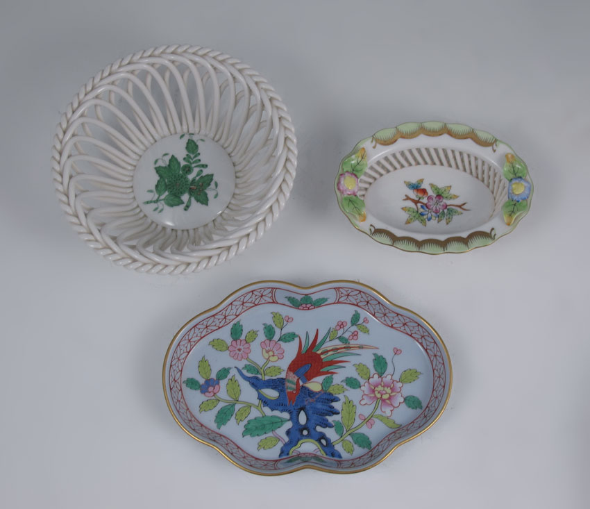 7 PIECE GROUP OF HEREND FINE PORCELAIN: 1) Covered urn with scroll handles, 10''. 2) Black ground foo dog, 6''. 3) A 2'' potpourri jar. 4) A 4'' pin tray. 5) A covered dresser jar, 2''h. x 5''. 6) A 4 1/2'' oval basket. 7) A 4 1/2'' round basket. Sold with an Austrian covered potpourri jar, 3'' x 4''.
