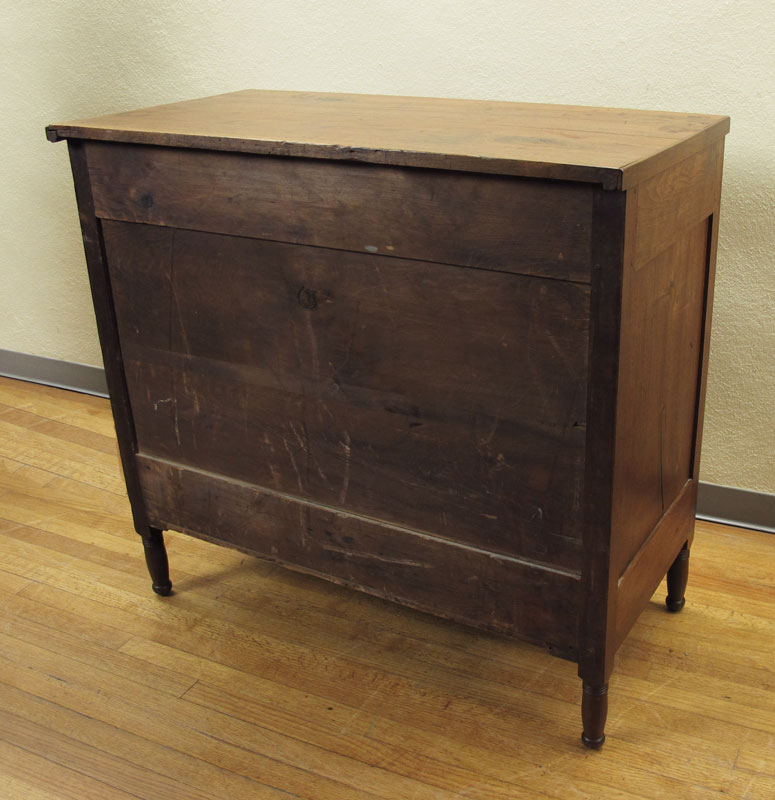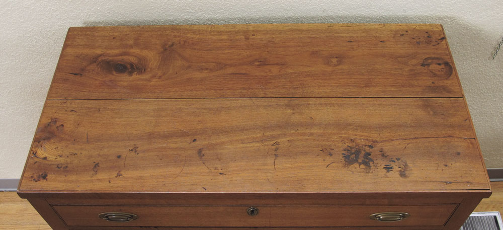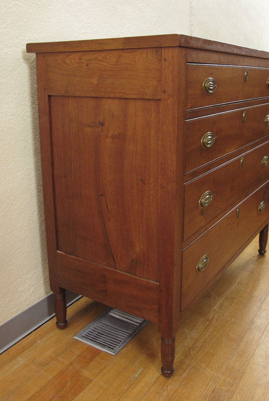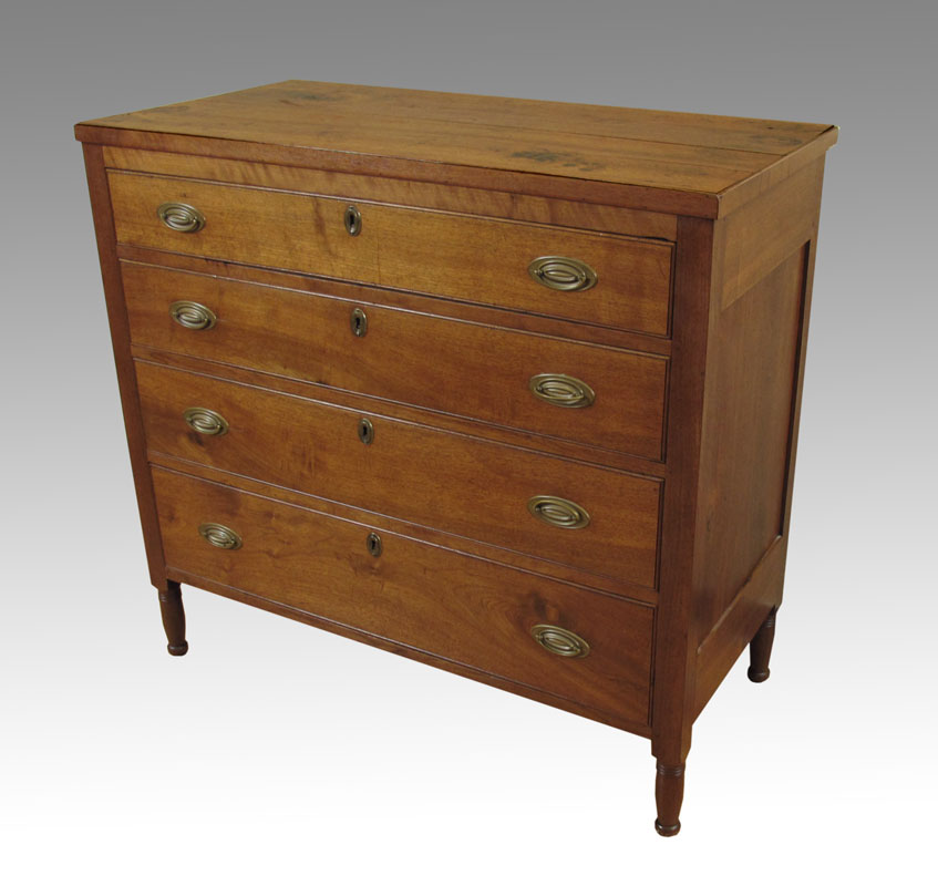 SHERATON PERIOD 4 GRADUATED DRAWER DRESSER: Cherry 2 board top. Original hardware with brass escutcheons. Paneled sides on turned legs. 40 1/2'' h. x 43'' x 21 1/2''.