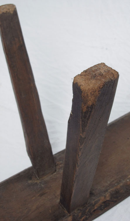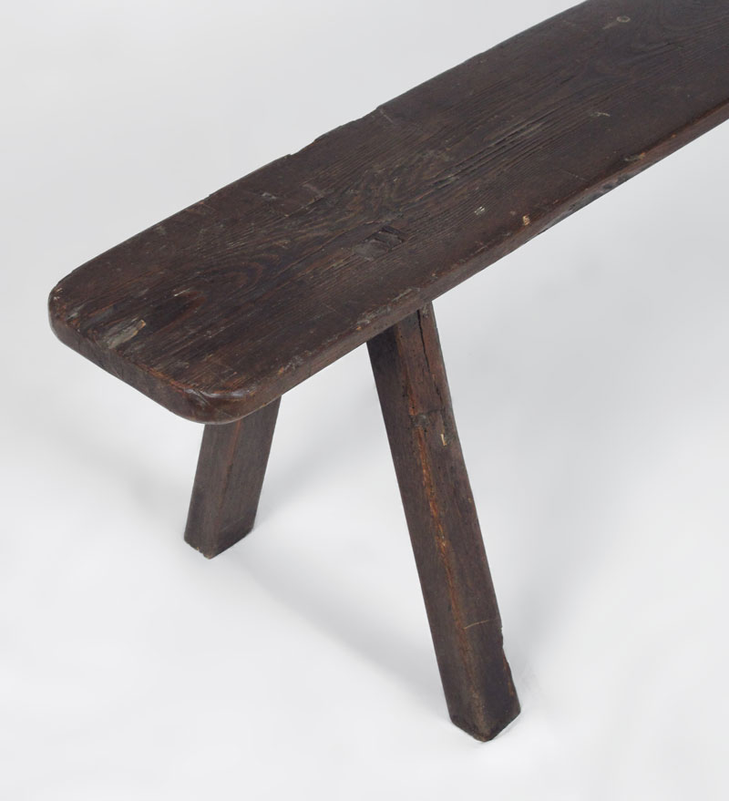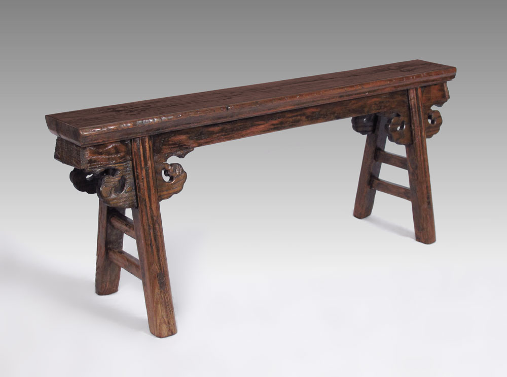 ANTIQUE ENGLISH BENCH: Unusual carved fittings join the legs and single board top. 47''l. x 19''h.