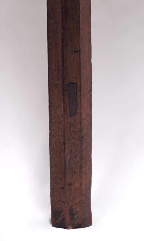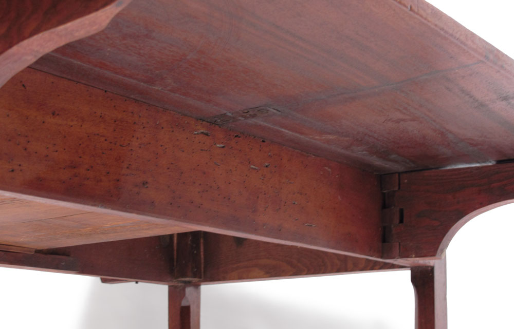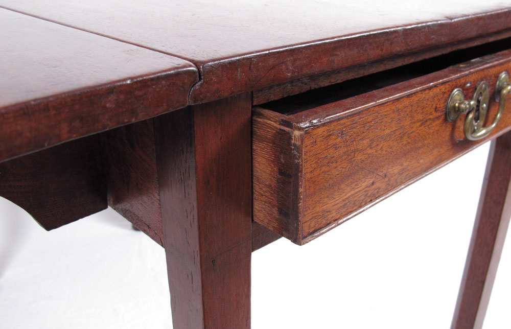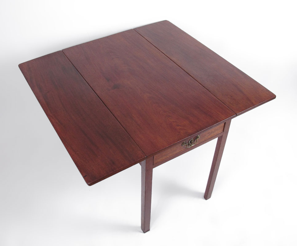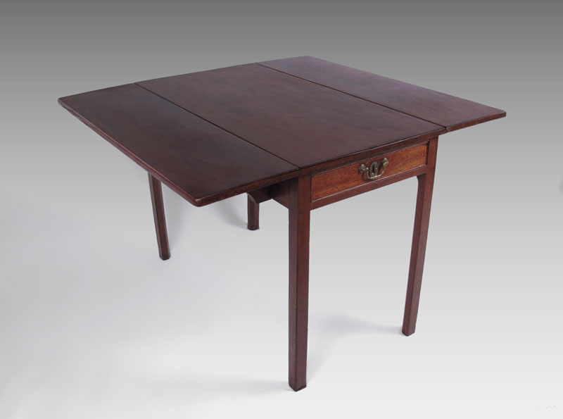 CA. 1800 MAHOGANY DROP LEAF TABLE: Single drawer table, four hand hewn straight legs. Approx. 28 1/2'' tall x 20'' wide x 44''. The drop leaves are 11'' each.
