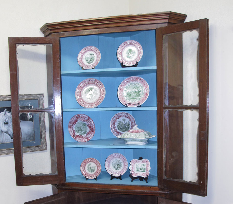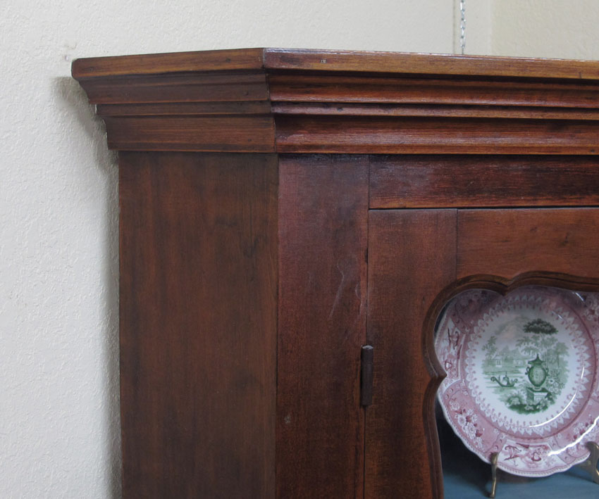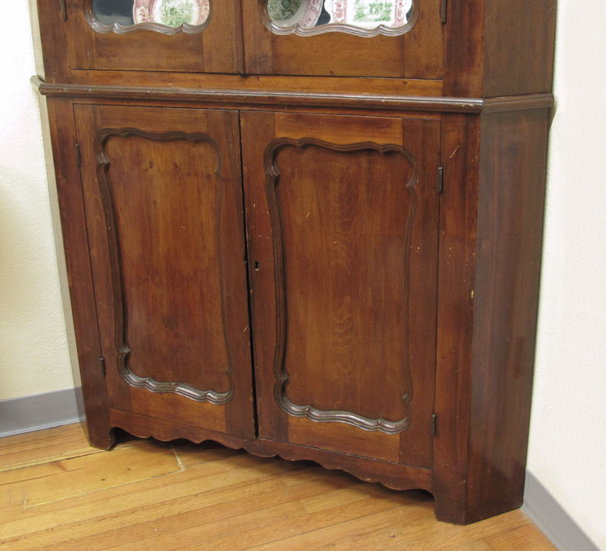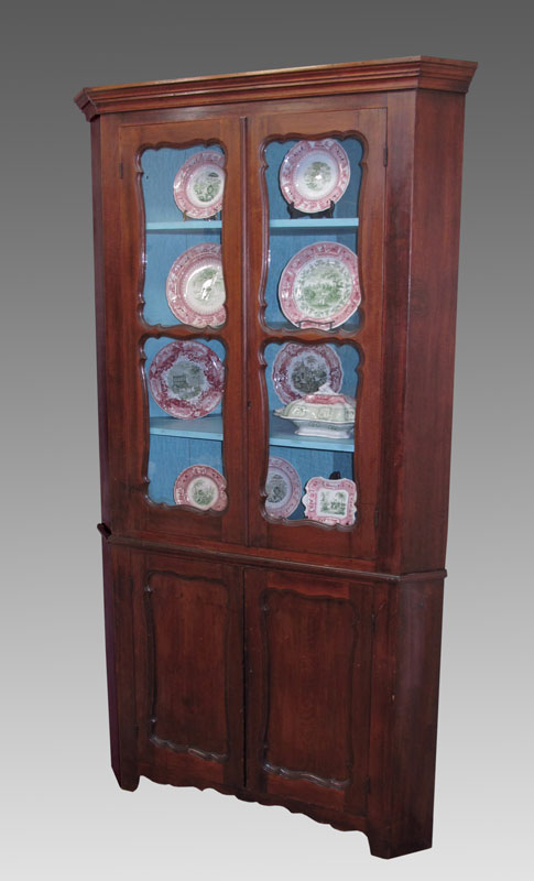 19TH C AMERICAN CORNER CABINET: Two part cabinet, the shaped panels on the lower section mimic the shape of the glass on the upper section. Upper with painted interior and plate grooves. Molded cornice. Measures approx. 89''h. x 47'' wide across the front x 24 1/2'' deep.