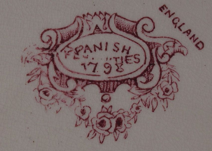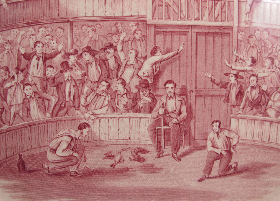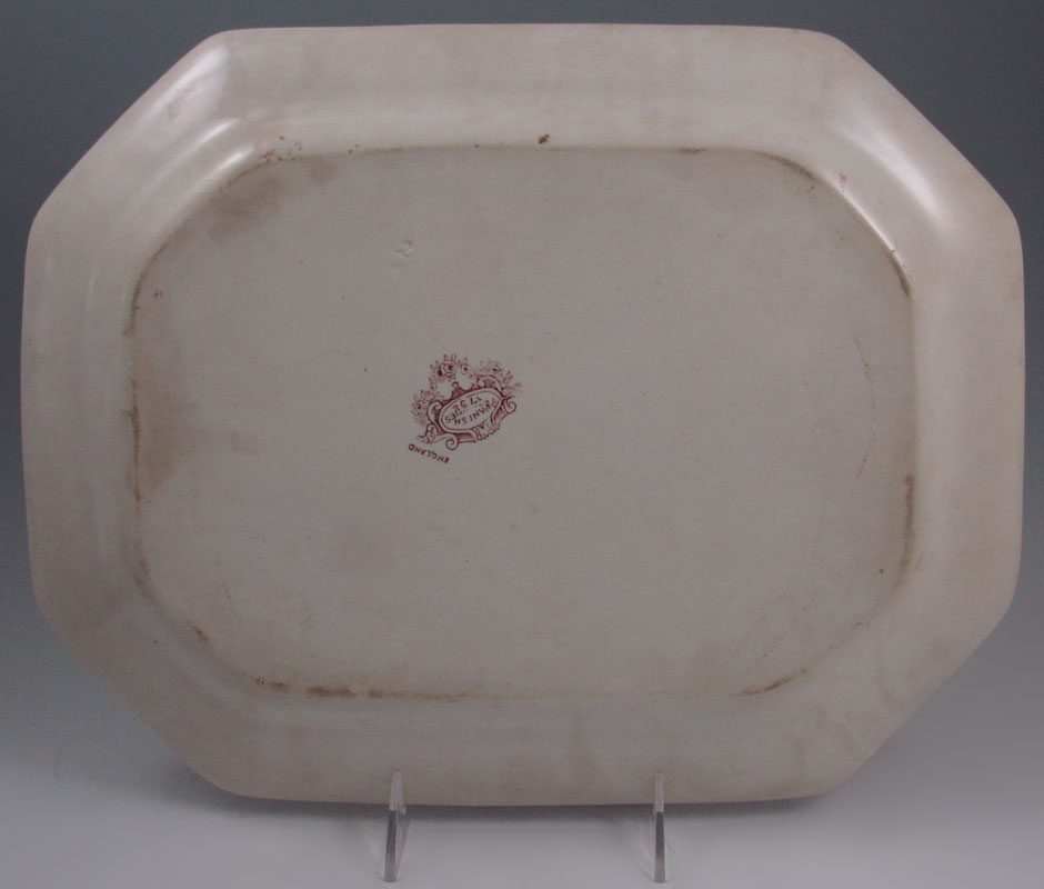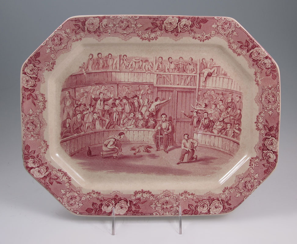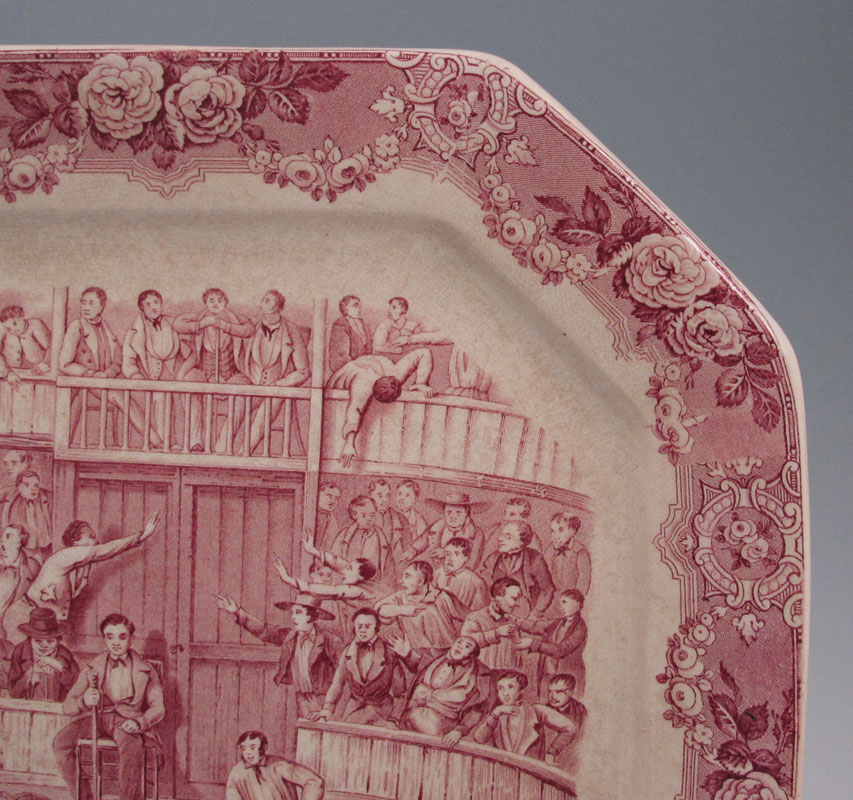 19th C RED TRANSFERWARE PLATTER DEPICTING A COCKFIGHT: Pattern appears to be Spanish Festivities or Beauties, rose and swag border. 14 1/2'' x 11''.