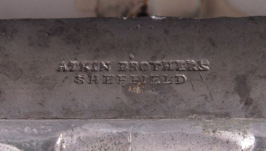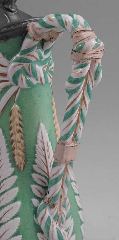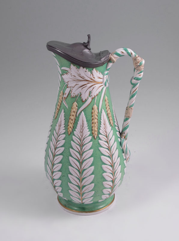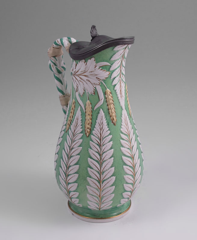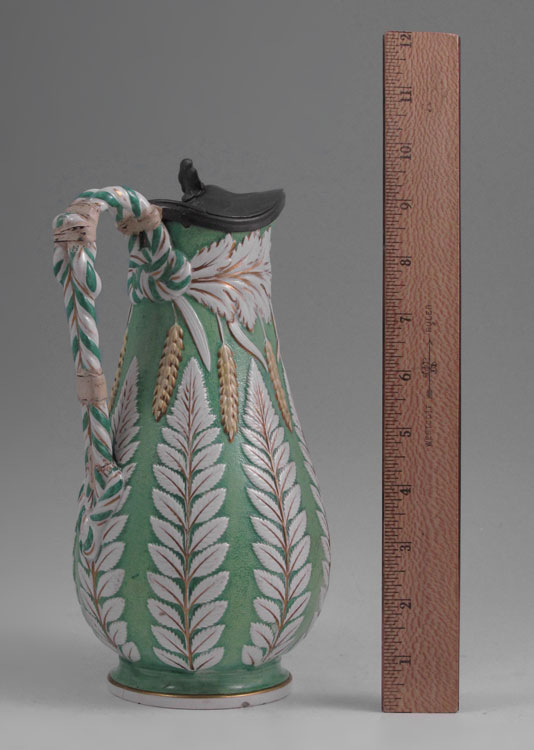 STAFFORDSHIRE PITCHER WITH PEWTER LID: Raised wheat and leaf design, marked with illegible Staffordshire knot design, possibly William Brownfield & Sons. Hinged pewter lid. 10'' h. x 5 1/4''.