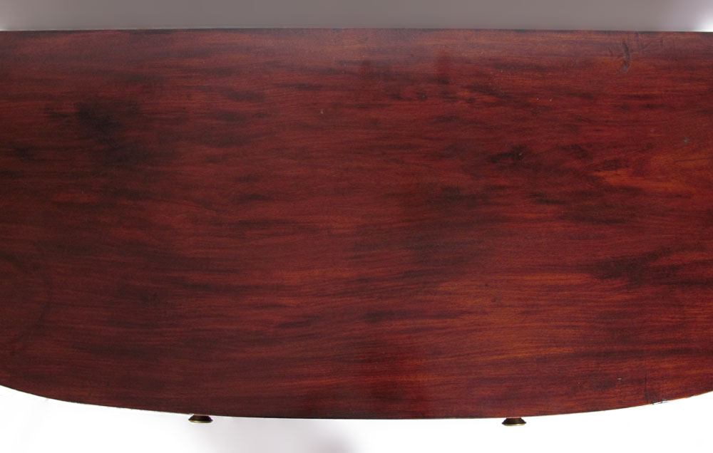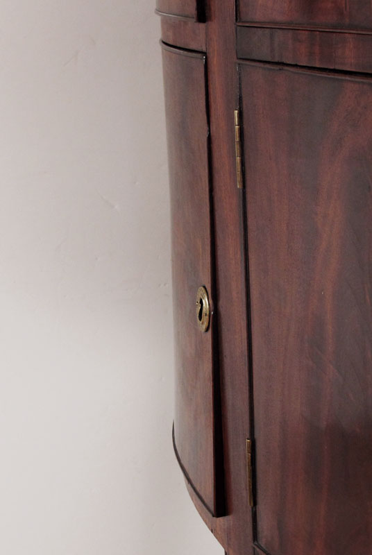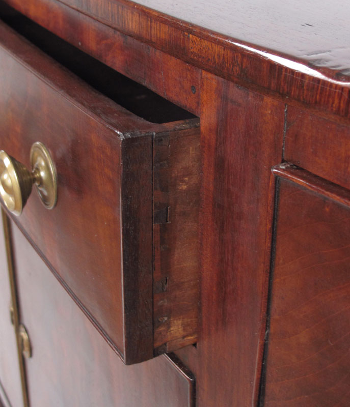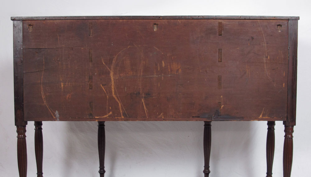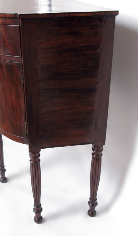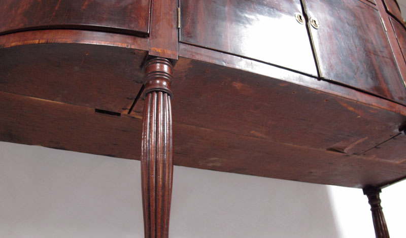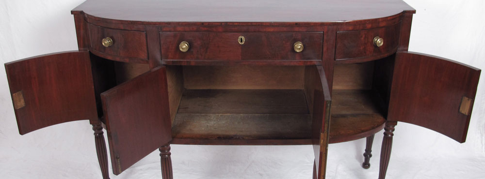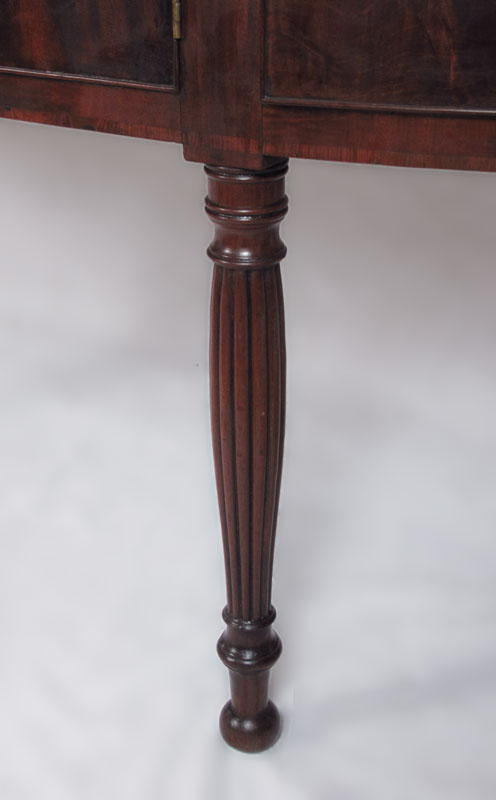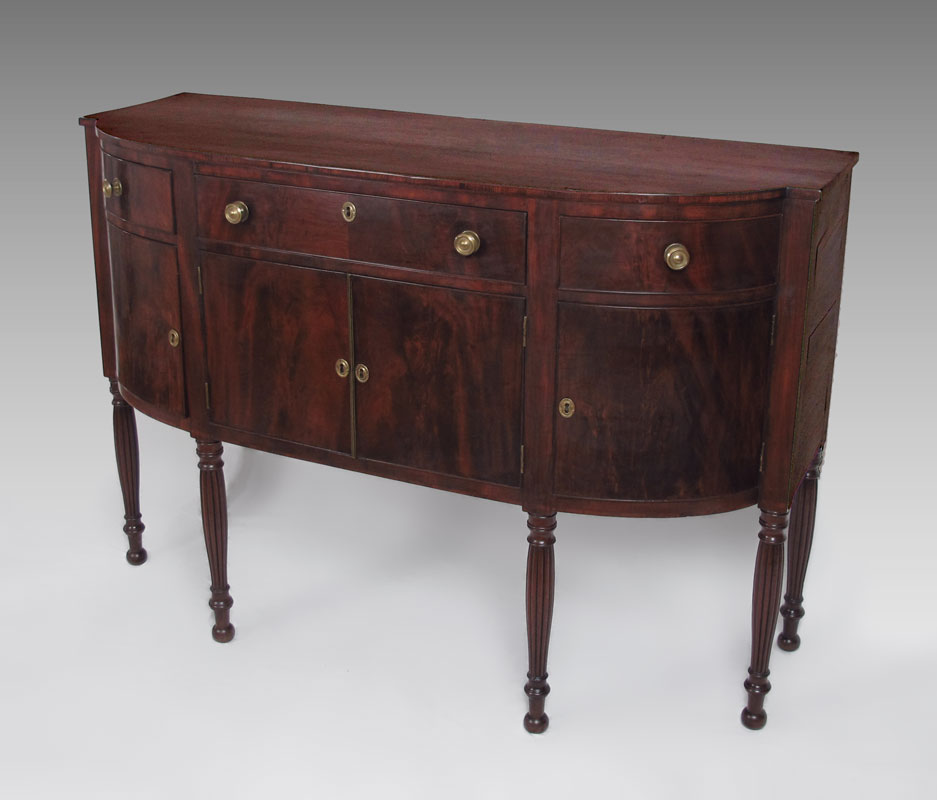 EARLY 1840'S FLAME GRAIN MAHOGANY SIDEBOARD: Mid Atlantic. 3 drawer over 4 door on 6 carved and turned legs, brass hardware. Key in office. 41 1/2'' x 60 1/4'' x 22 1/4''