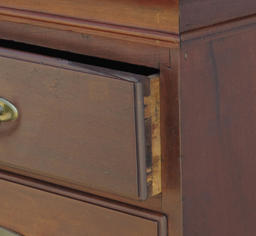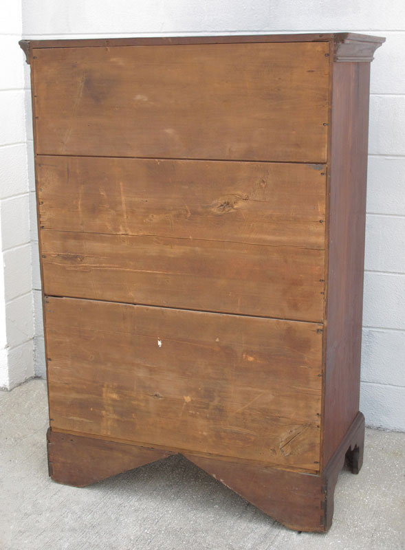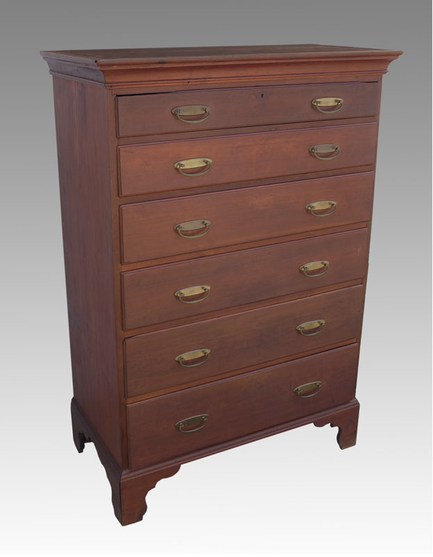 NEW ENGLAND PERIOD CHIPPENDALE CHEST: Molded top over graduating six drawer chest on cut bracket feet. 55'' tall x 38'' x 20 1/2''.
