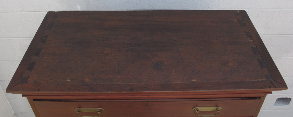 CONDITION: Top drawer with 2 missing pieces, replaced brass pulls and refinished condition.