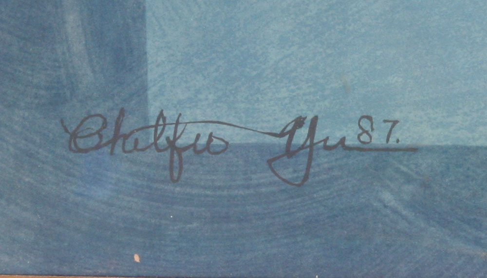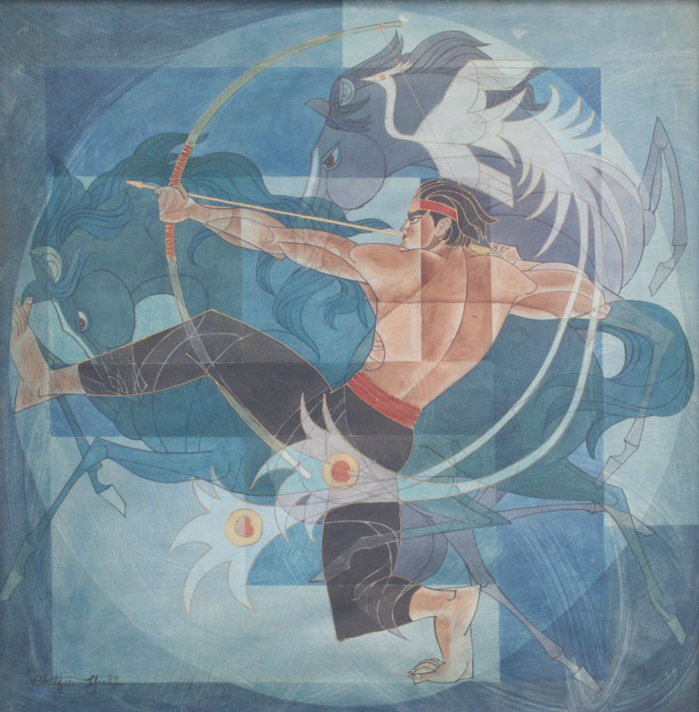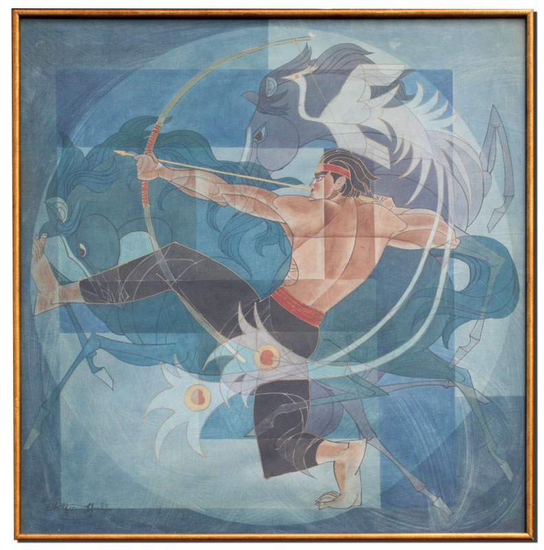 YU, Chitfu (Thai, 20th Century): Archer with Horses, Painting on Textile, sight size 39 1/2'' x 39 3/4'', signed lower left and dated 1987, framed 41'' x 41''.