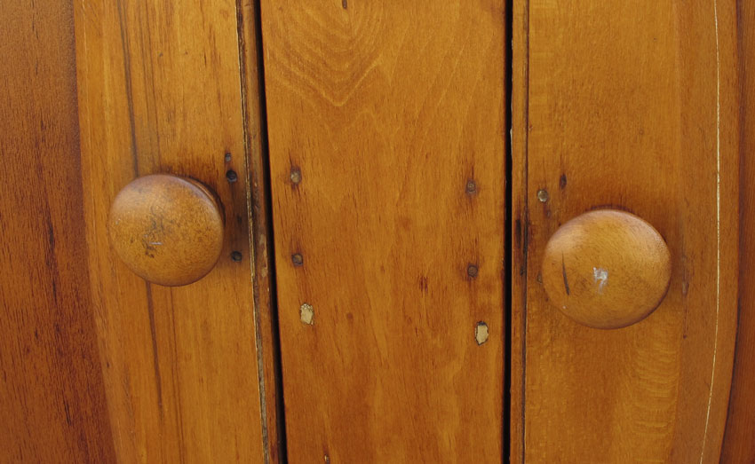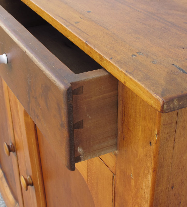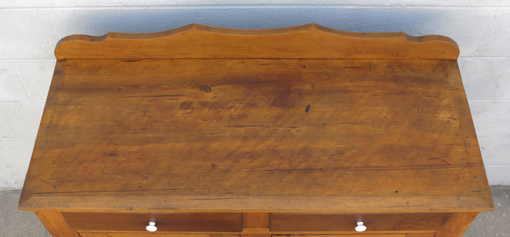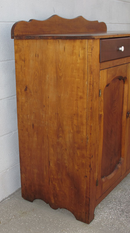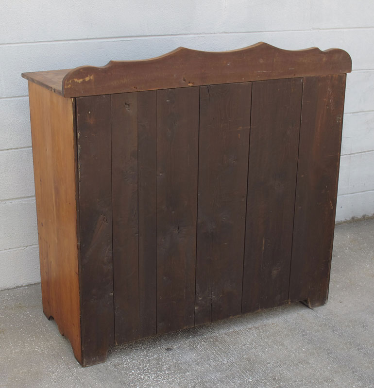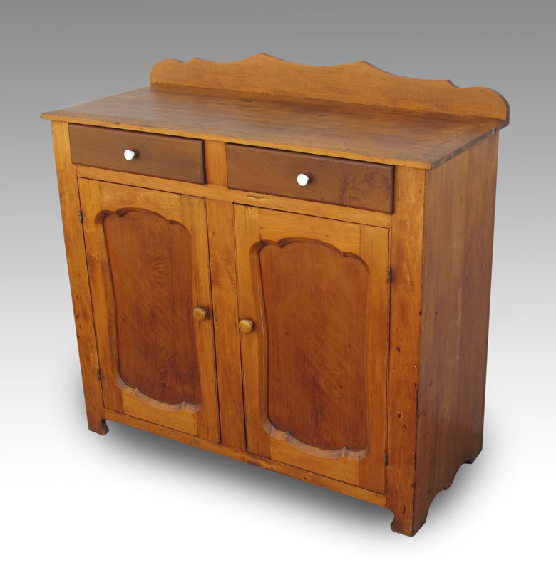 19TH C. PINE 2 DOOR COUNTRY CABINET: Top with beveled edge and backsplash, 2 drawer over 2 door with shaped recessed panels over cut base. 41'' h. x 42 1/2'' x 18 1/2''.