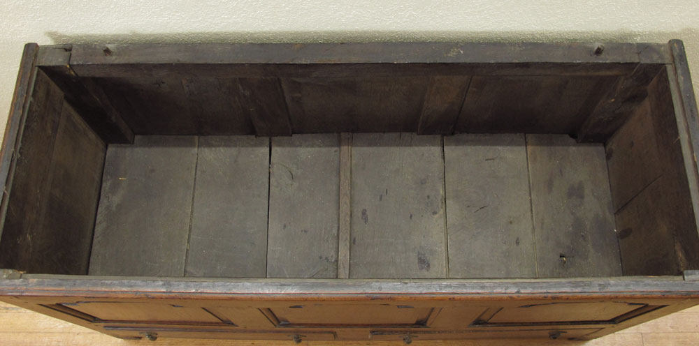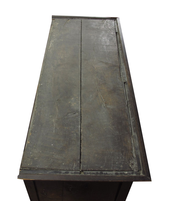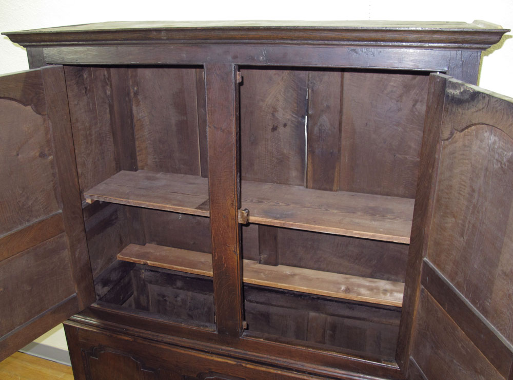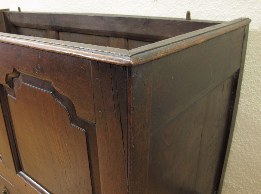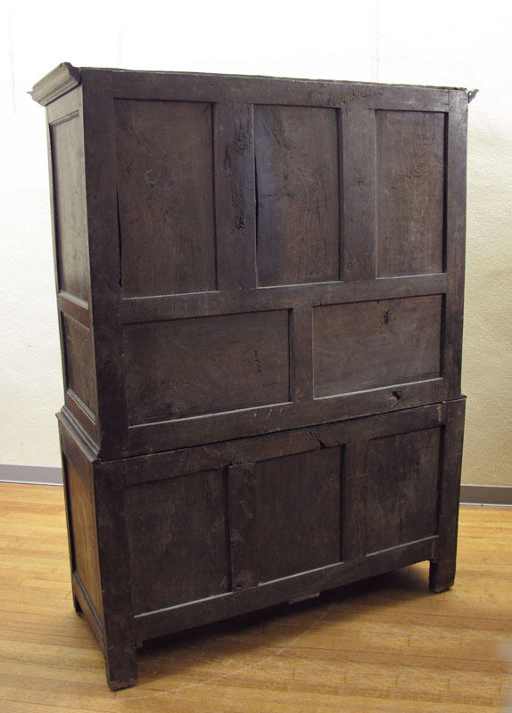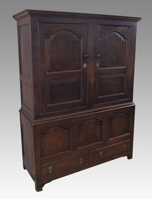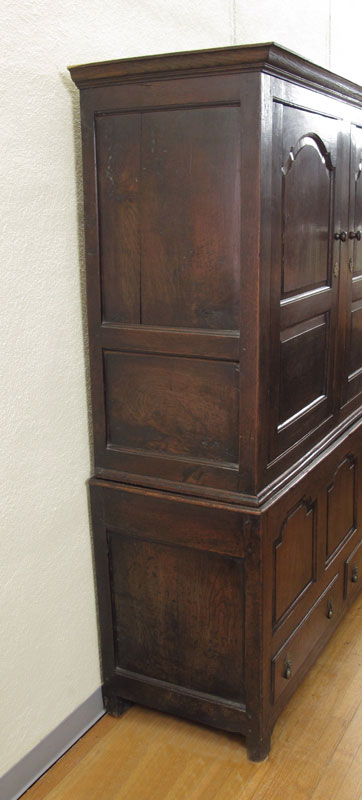 EARLY 18TH CENTURY ENGLISH OAK PRESS / CHEST ON CHEST: 2 door top with tombstone raised panels, crown molding, original brass hardware and lock. Base with three paneled front over 2 drawers with drop pulls. 72 1/2'' h. x 55 1/2'' x 21 1/4''.
