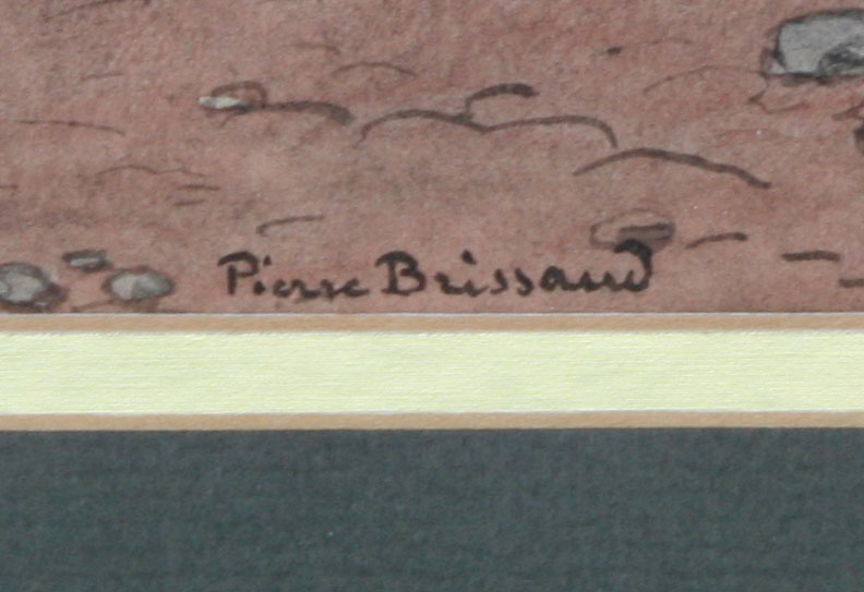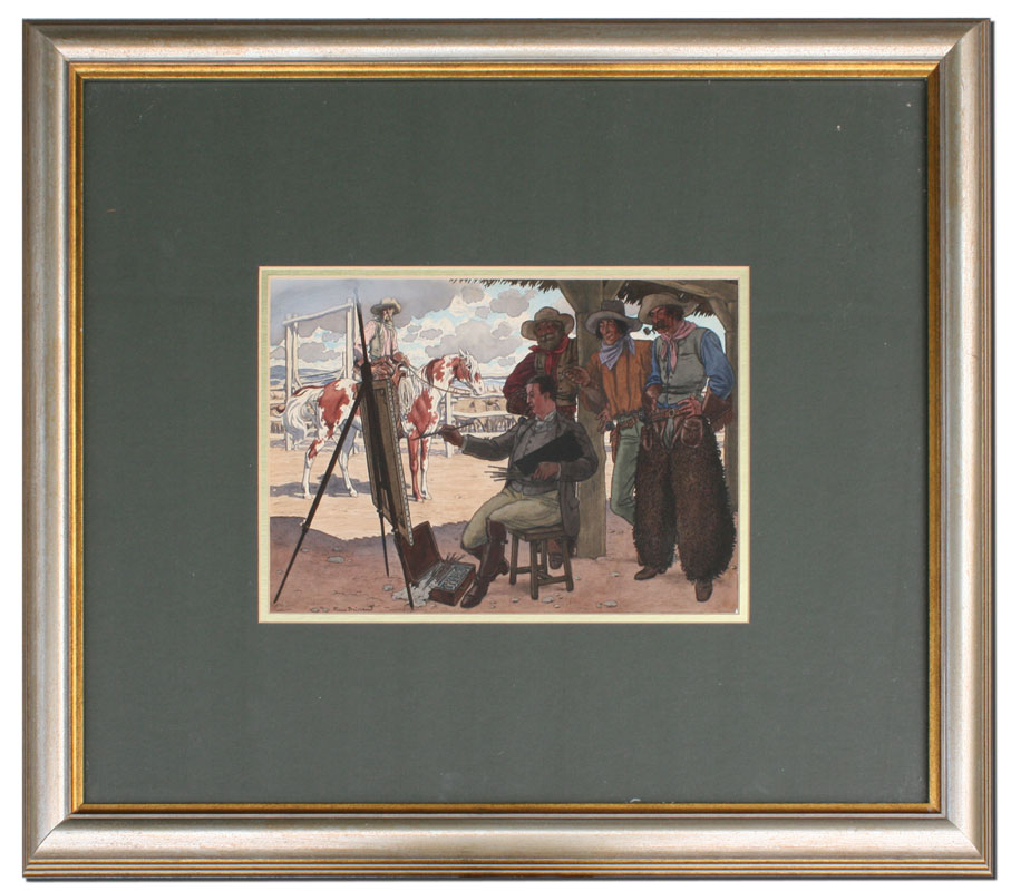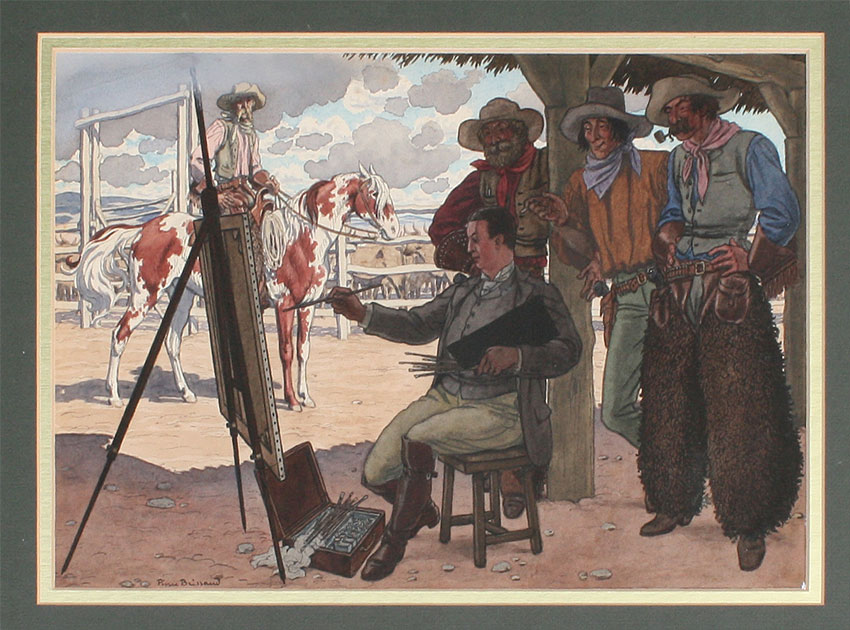 BRISSAUD, Pierre, (French, 1885-): Western Scene With the Artist at Dude Ranch, Cowboys Looking on, Watercolor, site size 8 3/4'' x 13'', signed lower left, framed, 22'' x 27''.
