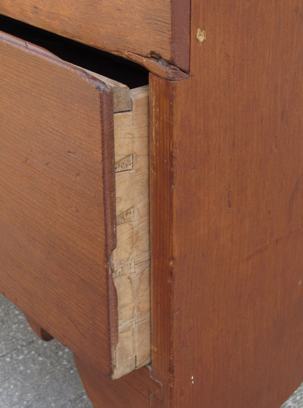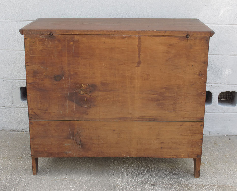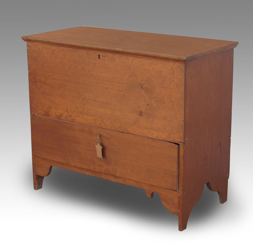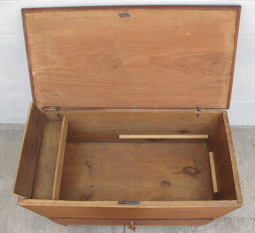 LATE 18TH C NEW ENGLAND ONE DRAWER LIFT TOP BLANKET CHEST: Lift top with snipe hinge. Interior till with lock in place. Single dovetailed drawer with missing lock. Single board construction with boot jack ends finished in a red wash. 33'' h. x 39 1/2'' x 20 1/2''.