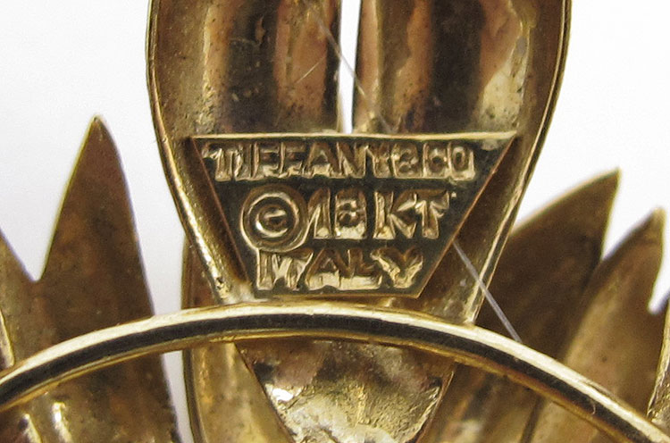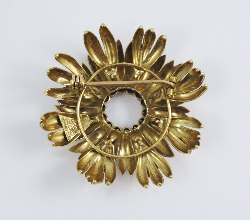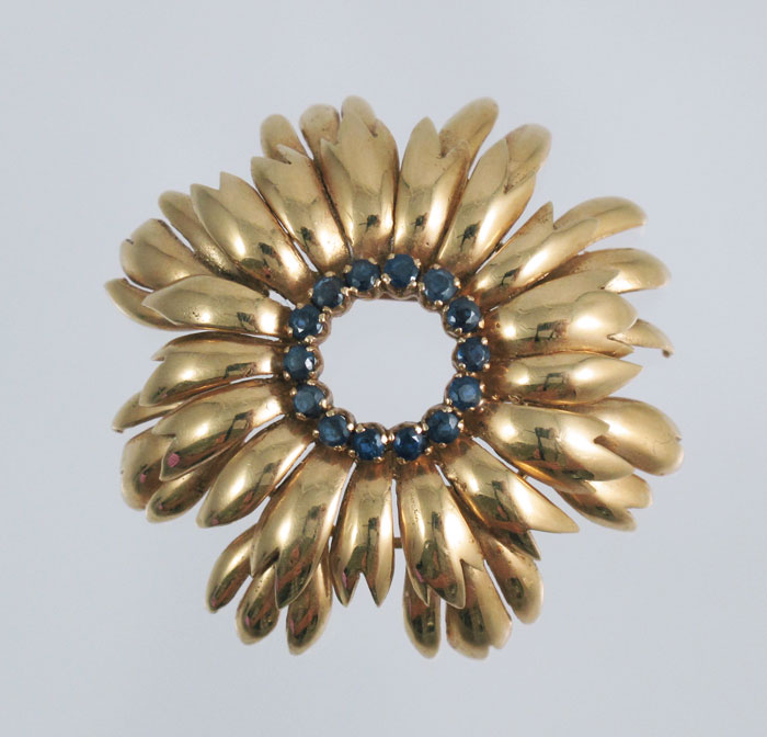 18K GOLD TIFFANY & CO SAPPHIRE BROOCH: 18K yellow gold stylized flower brooch contains 14 round mixed cut sapphires. Weight: .85 Ct. Approx. Rated VS in clarity (Type II), B in Hue, 4-5 in Tone and 3-4 in Saturation. The sapphires are prong set. Bar pin closure. Signed: Tiffany & Co. Diameter 1 1/2''. Weight: 14.0 grams.