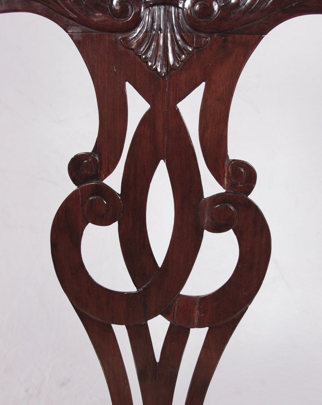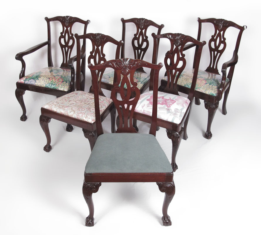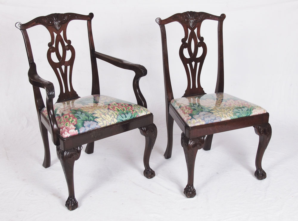 SET OF 6 CHIPPENDALE STYLE DINING CHAIRS: 2 arm, 4 side chairs. Pierced back, carved top rail, straight skirt, carved knees on the cabriole legs ending in ball and claw feet. 38'' h. x 22 1/4'' x 20''.