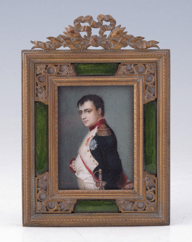 19TH C. MINIATURE ON IVORY OF NAPOLEON BONAPARTE: Oval size 2 1/2'' x 2'', signed P. STADLER, encased in period bronze and guilloche frame with scrolling foliate motif and bow cartouche at the top, 5'' x 3 1/2''.