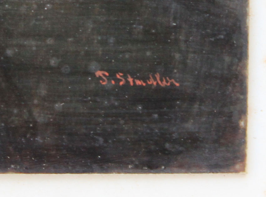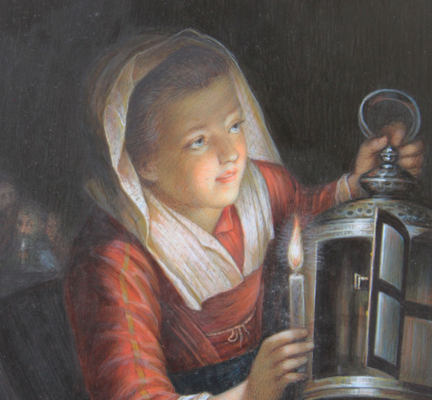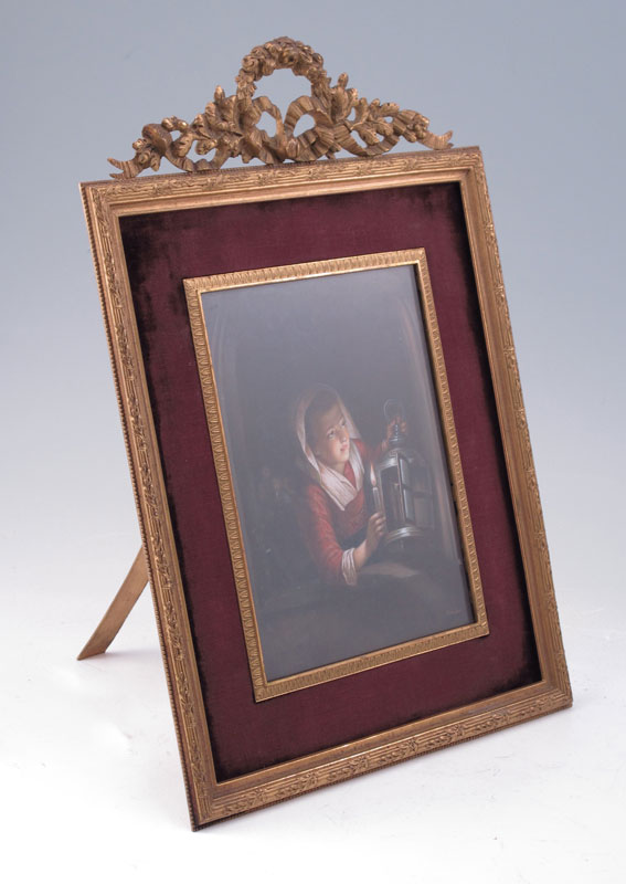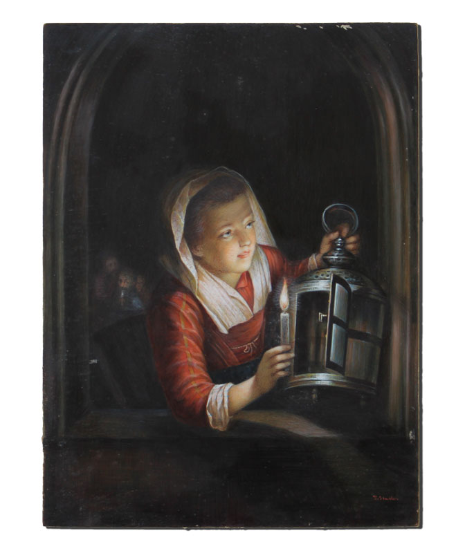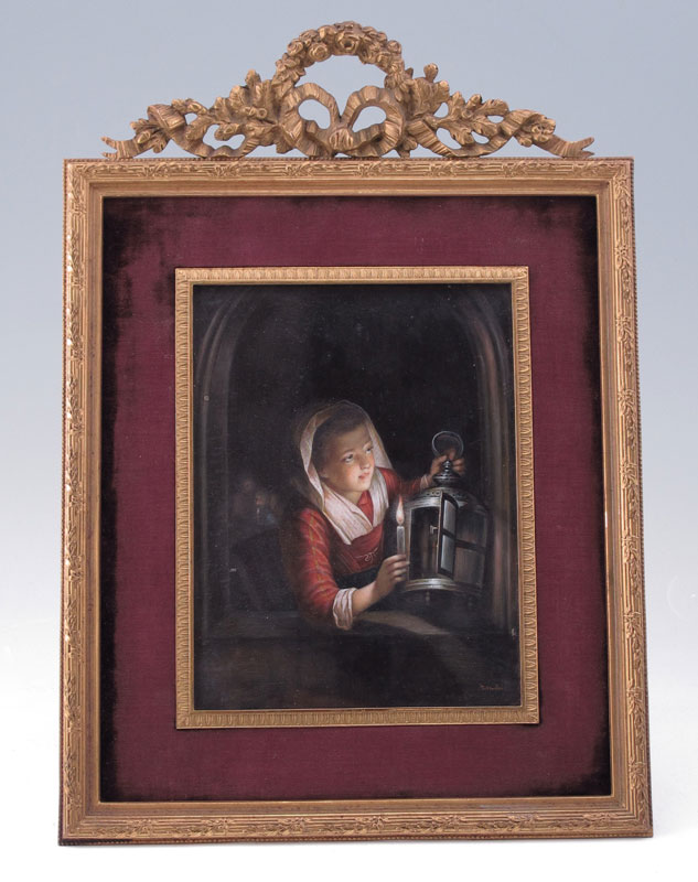 19TH C. MINIATURE PAINTING ON IVORY AFTER GERARD DOU: Depicts a Young Maiden Lighting a Lantern With Candle and Several Faces in the Background, square measurement 6 1/8'' x 4 1/2'', signed lower right P. STADLER, encased in a B. Altman and Company period metal easel back frame with floral and ribbon cartouche at the top, 11 1/2'' x 8''.