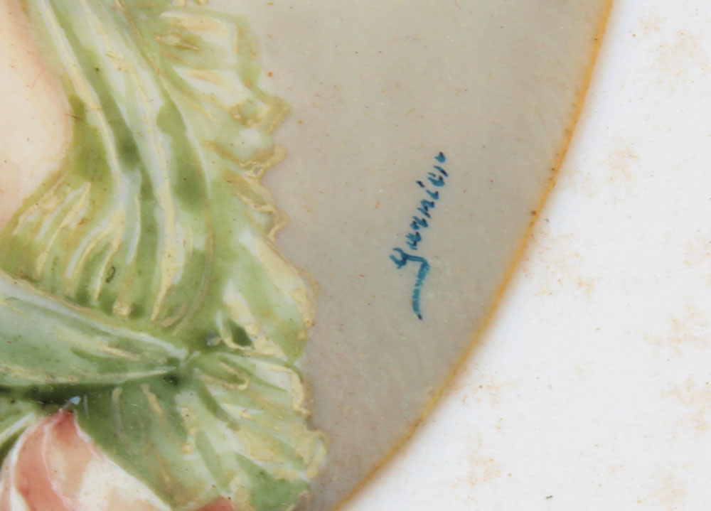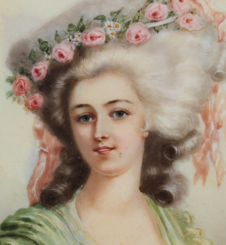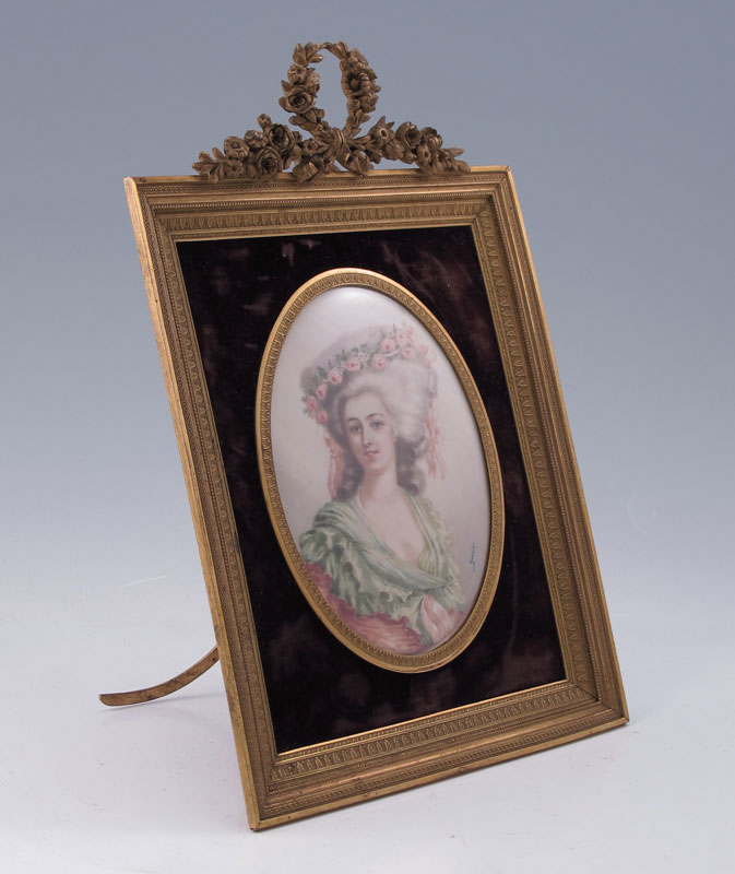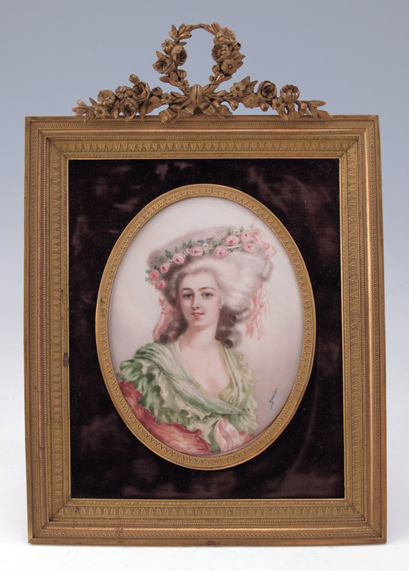 19TH C. MINIATURE WATERCOLOR ON IVORY OF A YOUNG MAIDEN WEARING A ROSE ADORNED HAT: Oval size 4 3/4'' x 3 3/4'', signed lower right GARNIER, encased in period easel back metal frame with floral cartouche at the top, 9 1/4'' x 6 1/2''.