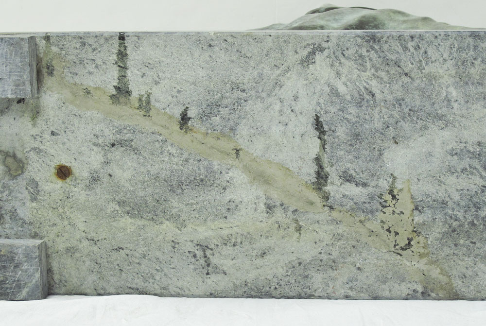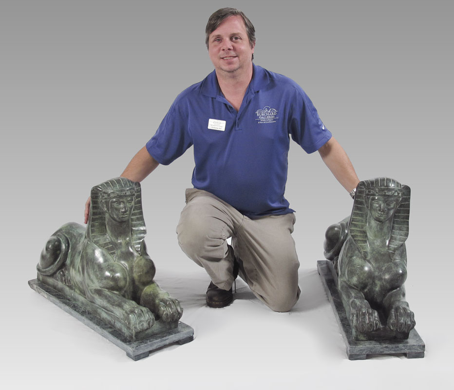 PAIR OF PATINATED BRONZE SPHINX WITH MARBLE BASES: 22'' h. x 34 1/2'' w. x 10'' d.
