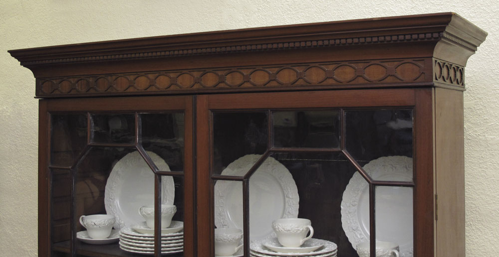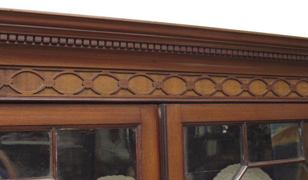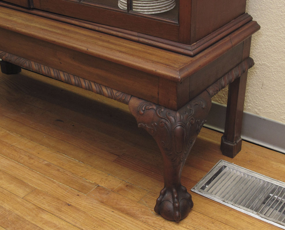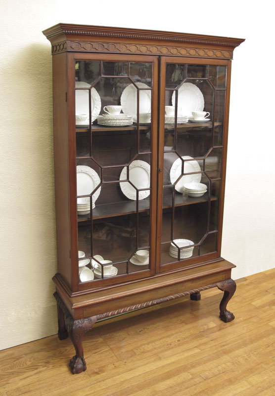 MAHOGANY CHIPPENDALE REVIVAL BOOKCASE ON STAND CA 1865: Epstein of London. Two doors with individually glazed panes. Ball and claw foot base. 75'' h. x 45'' x 16''.