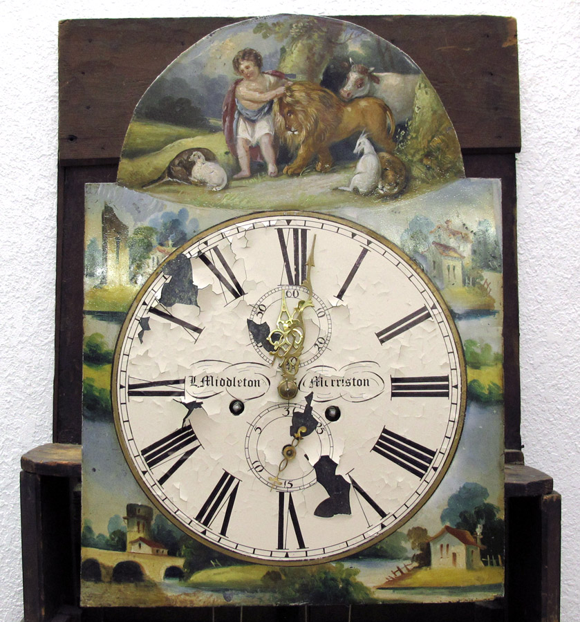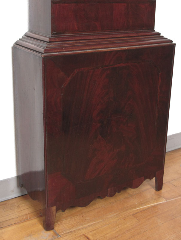 L. MIDDLETON ENGLISH LONG CASE CLOCK: Broken arch pediment with center brass eagle on ball finial. Flame mahogany veneer case. Carved and turned full column supports on bonnet, shaped case and door. Painted face featuring vignettes of child with animals, scenes of buildings. Face marked L. Middleton, Morriston. Dual weight and pendulum time and strike movement. Secondary second and date dial. Back of base customized to fit over baseboards. 98'' h. x 24 3/4'' x 10 1/4''.