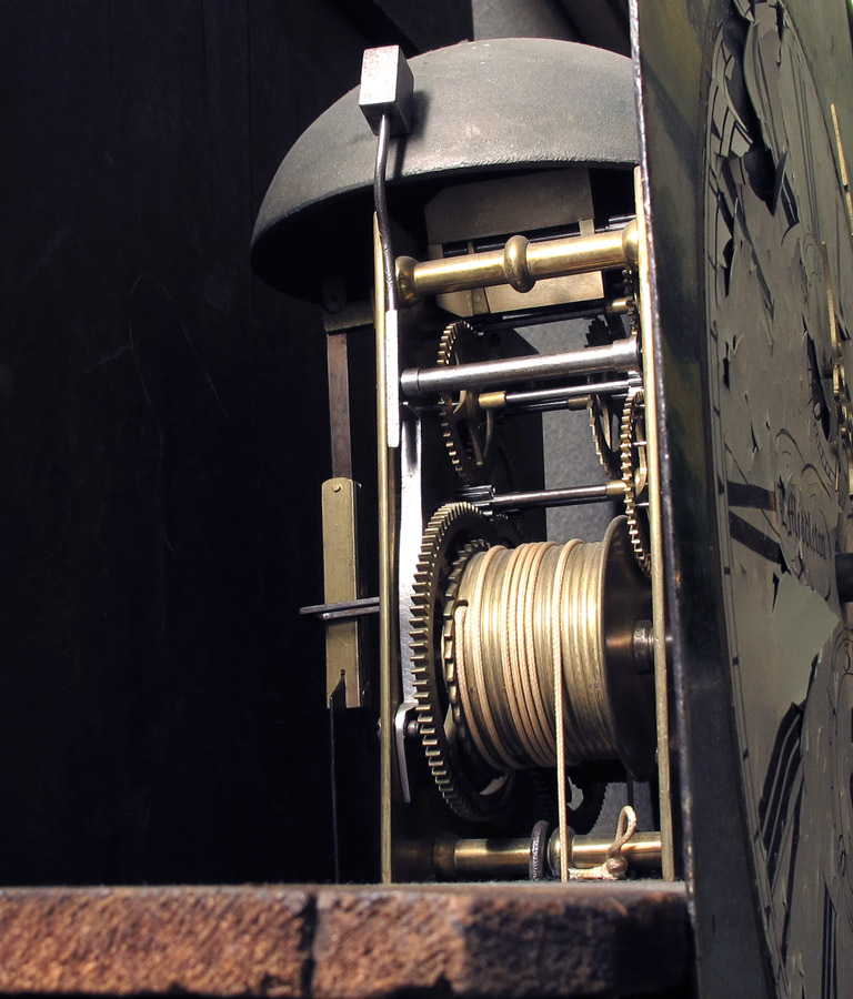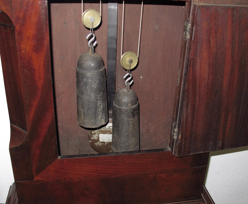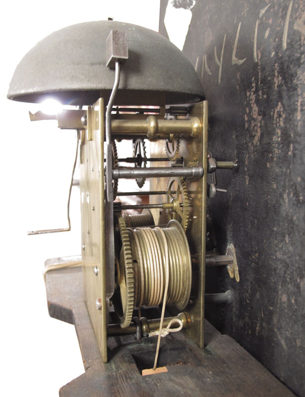CONDITION: Note paint loss and flaking to face, paint is very brittle. Veneer loss and chips to case. Will require restoration inside and out, pendulum may be replacement.