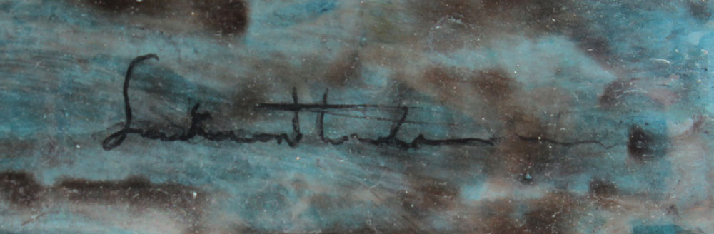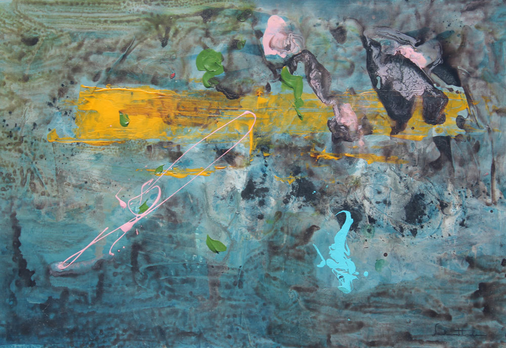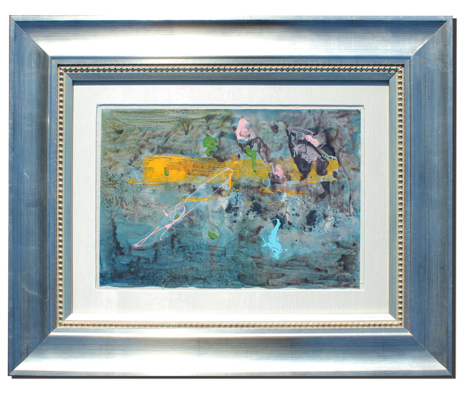 FRANKENTHALER, Helen, (American, 1928-): Abstract Composition with Bluish Background, Oil/Watercolor/Paper, float mounted, 11'' x 16'', signed lower right, encased in custom silver gilt frame, 22'' x 27''.