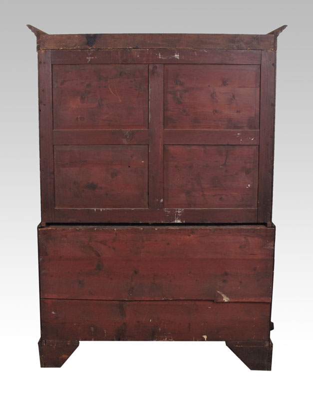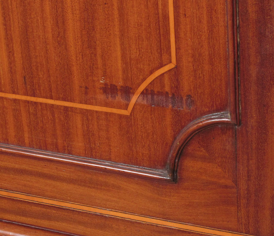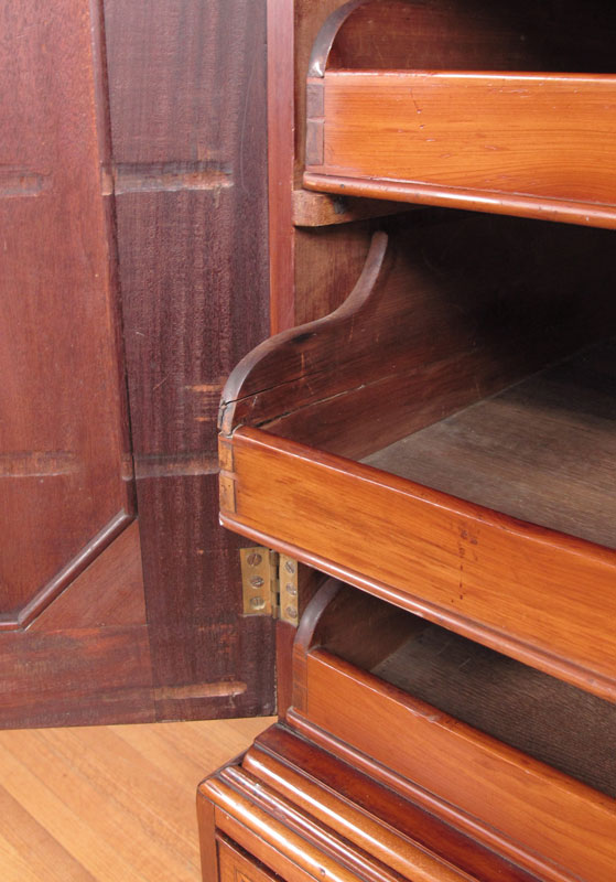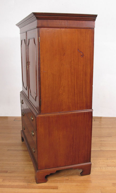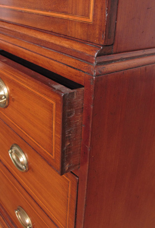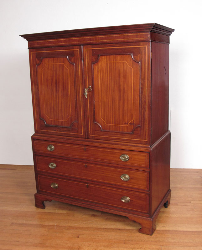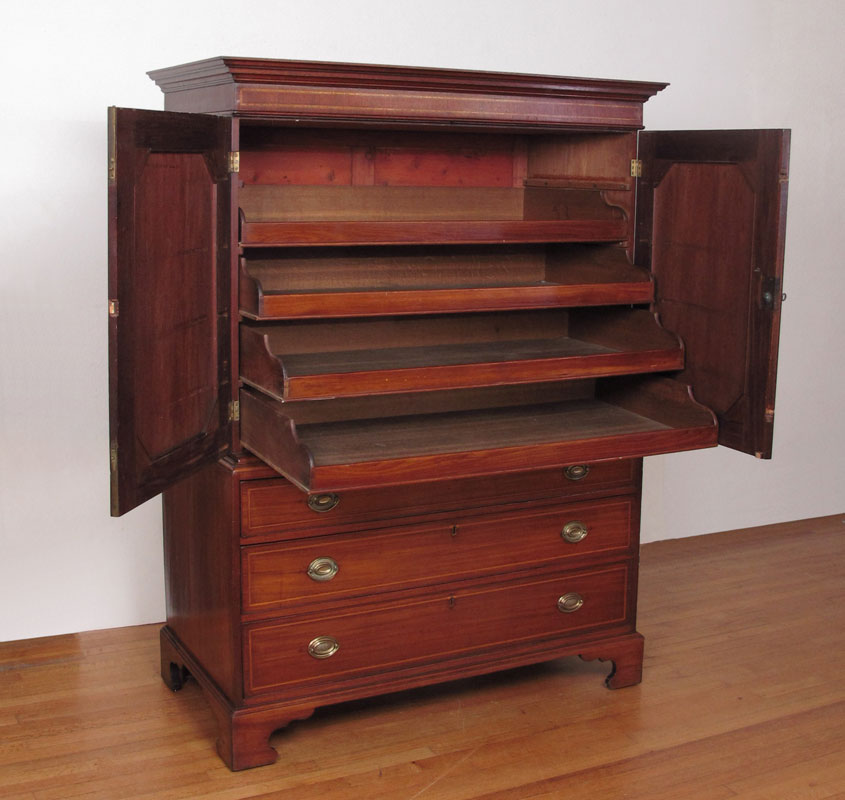 GEORGE III SHERATON PERIOD LINEN PRESS: Inlaid mahogany 2 part cabinet. Sliding trays to the top, bottom stand with drawers. 68 1/4'' h. x 48'' x 24 1/4''.
