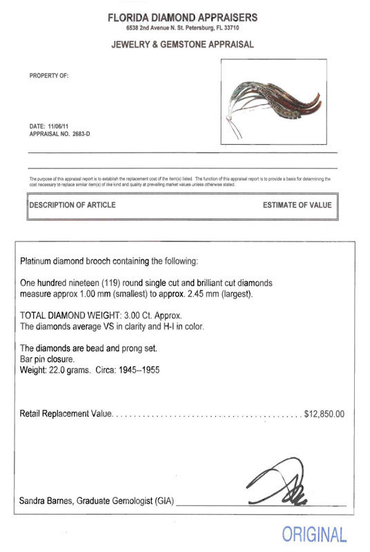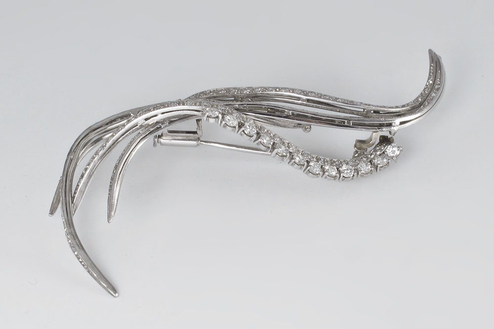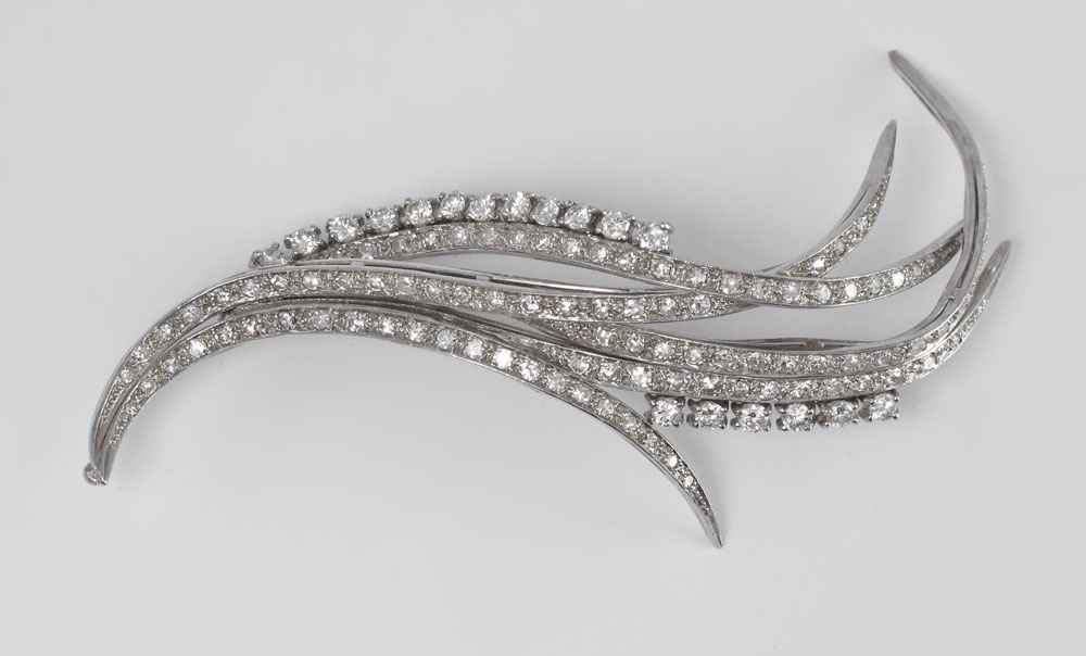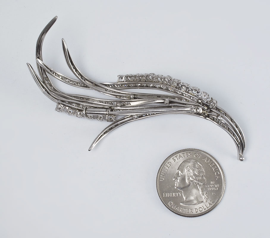 PLATINUM DIAMOND BROOCH, CA. 1945-1955: Sweeping branches of platinum covered with 119 diamonds all totaling approx. 3.0 Ct., averaging VS in clarity and H-I in color. Diamonds are prong and bead set. Bar pin closure. Length: 3 1/4''. Weight: 22 grams. Sold with current Florida Diamond Appraisers GIA graduates appraisal for $12,850.